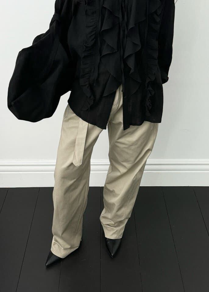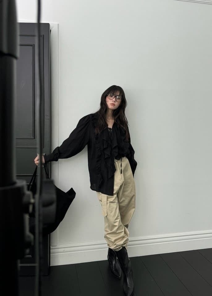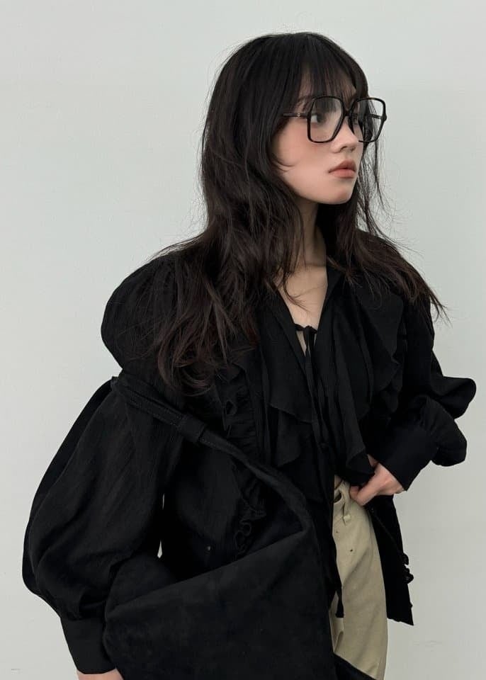 シンプルでありながらもこなれ感を演出してくれるブラックフリルブラウス。