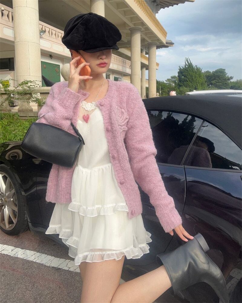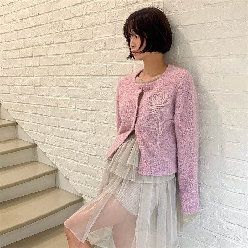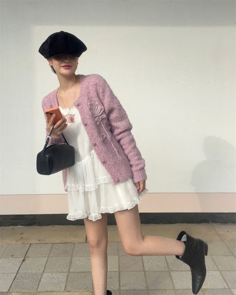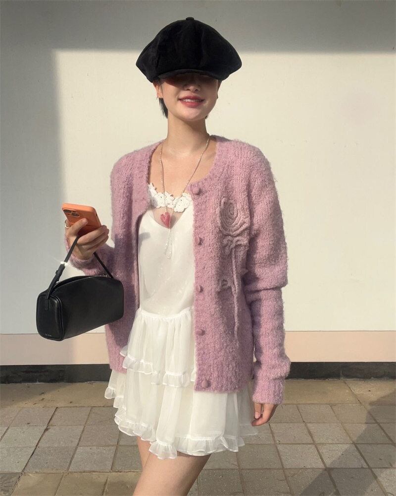 上品でありながらも可愛らしさを演出してくれるピンクローズカーディガン。