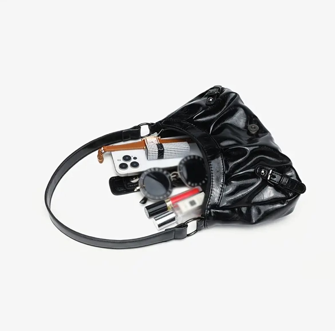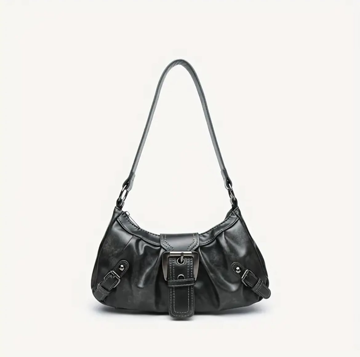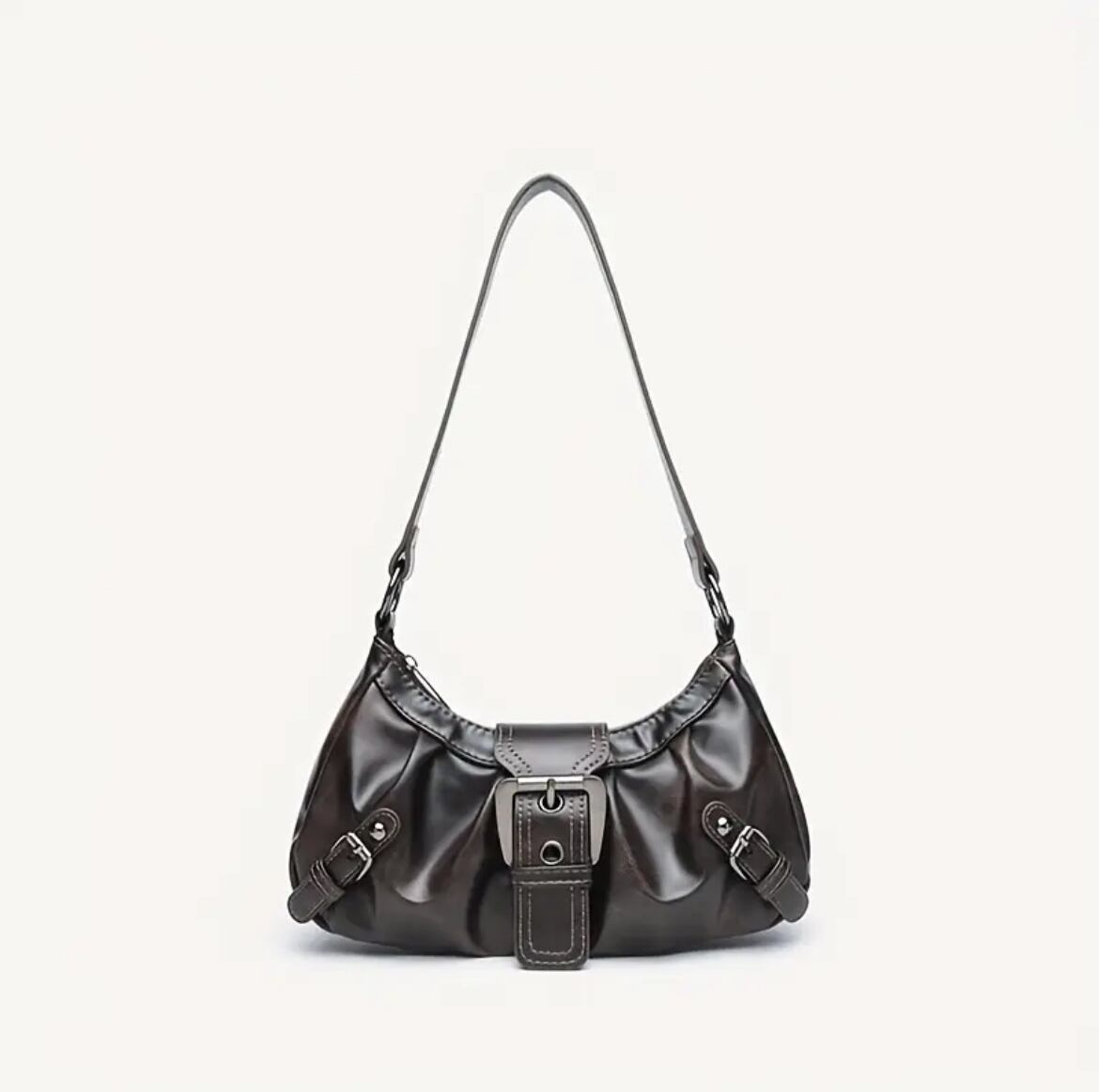 スタイリッシュなレザー調とベルトバックルが魅力のバックルショルダーバッグ。