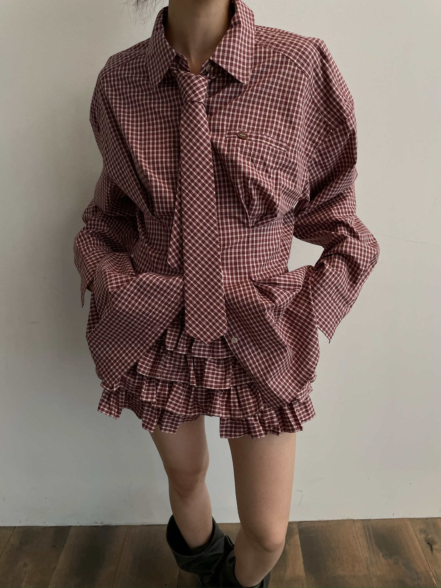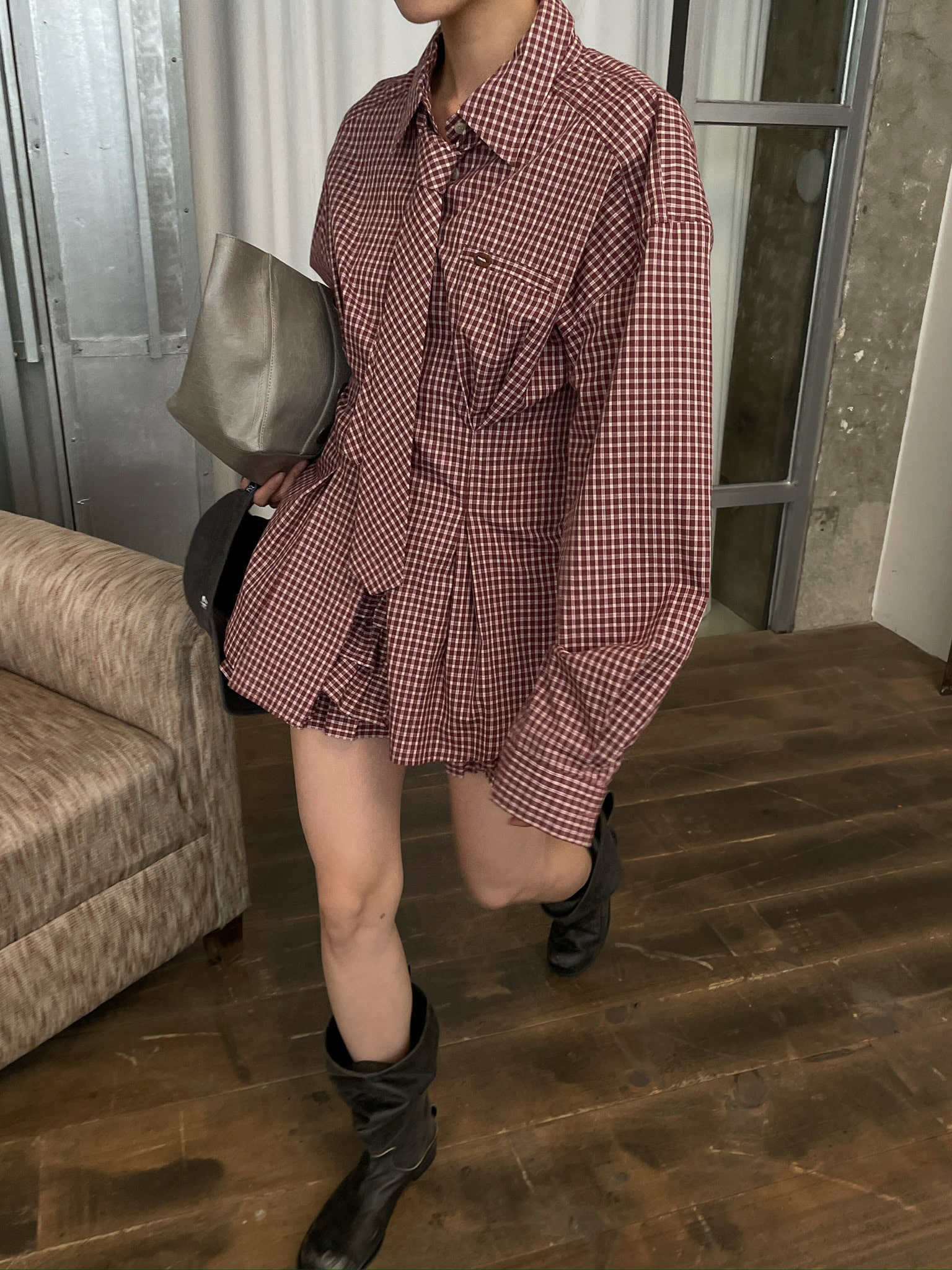 このセットアップは、シャツとレイヤードスカートの絶妙な組み合わせが魅力で、シンプルながらも個性的でおしゃれな印象を与えます。