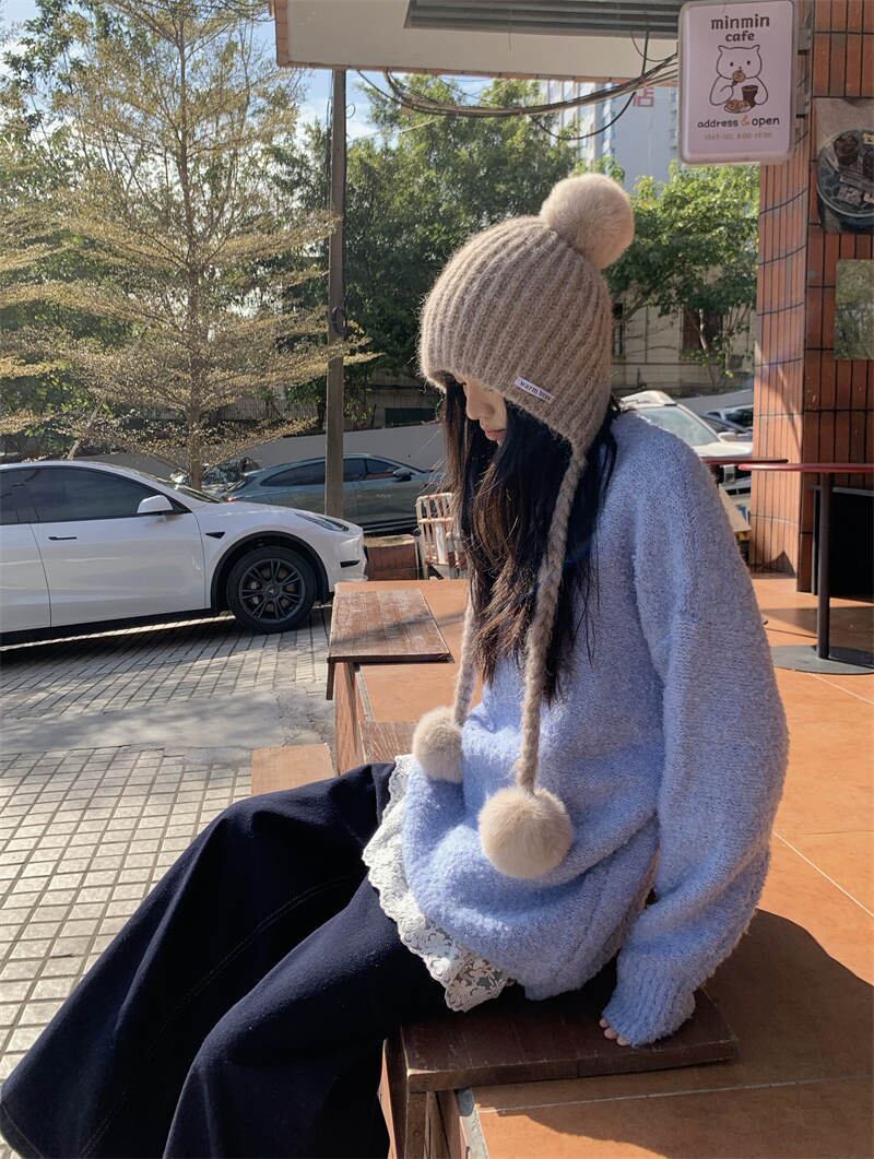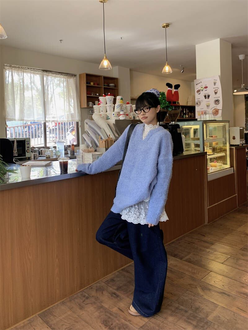 レースインナーは、上品さと女性らしさを演出し、ブルーニットと組み合わせることで、カジュアルながらもおしゃれな雰囲気を演出します。