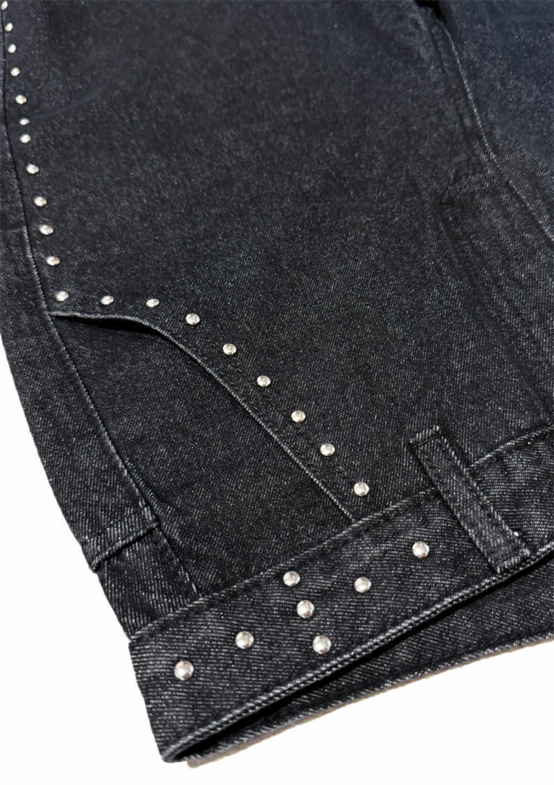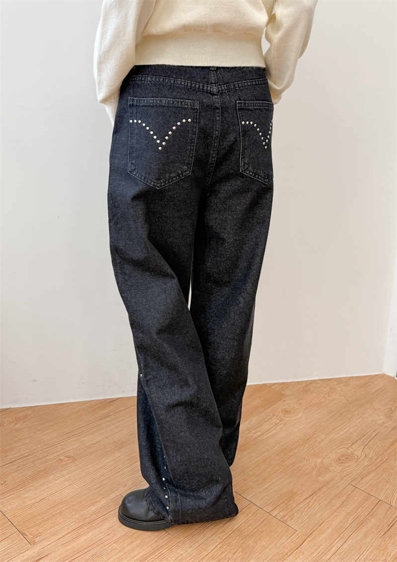 このデニムは、ストレートなシルエットが足元をすっきりと見せ、シルバーの装飾がさりげない華やかさを演出します。