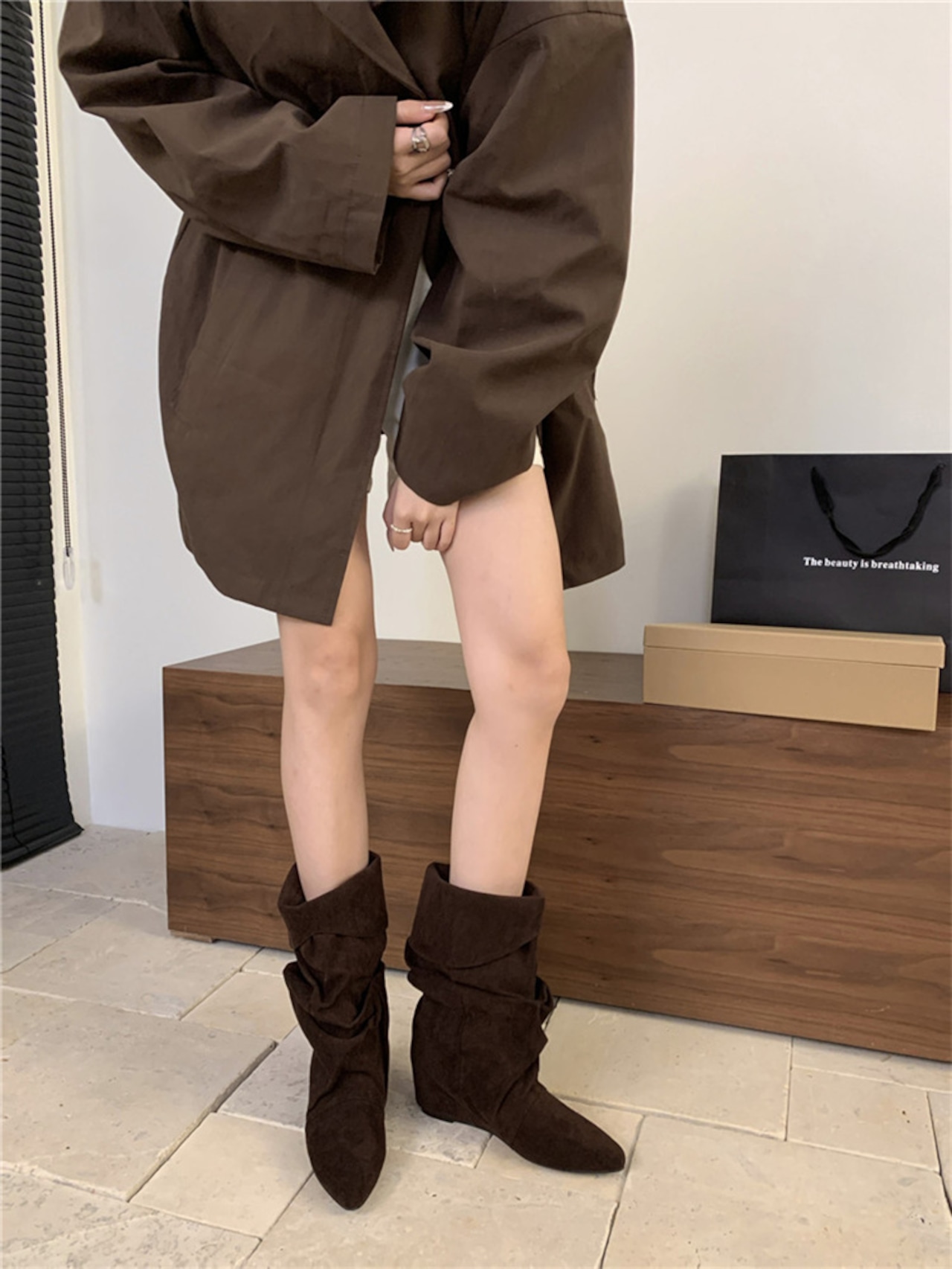 洗練された足元を演出するルーズウェッジソールブーツ。