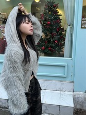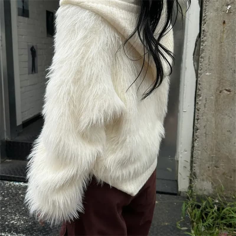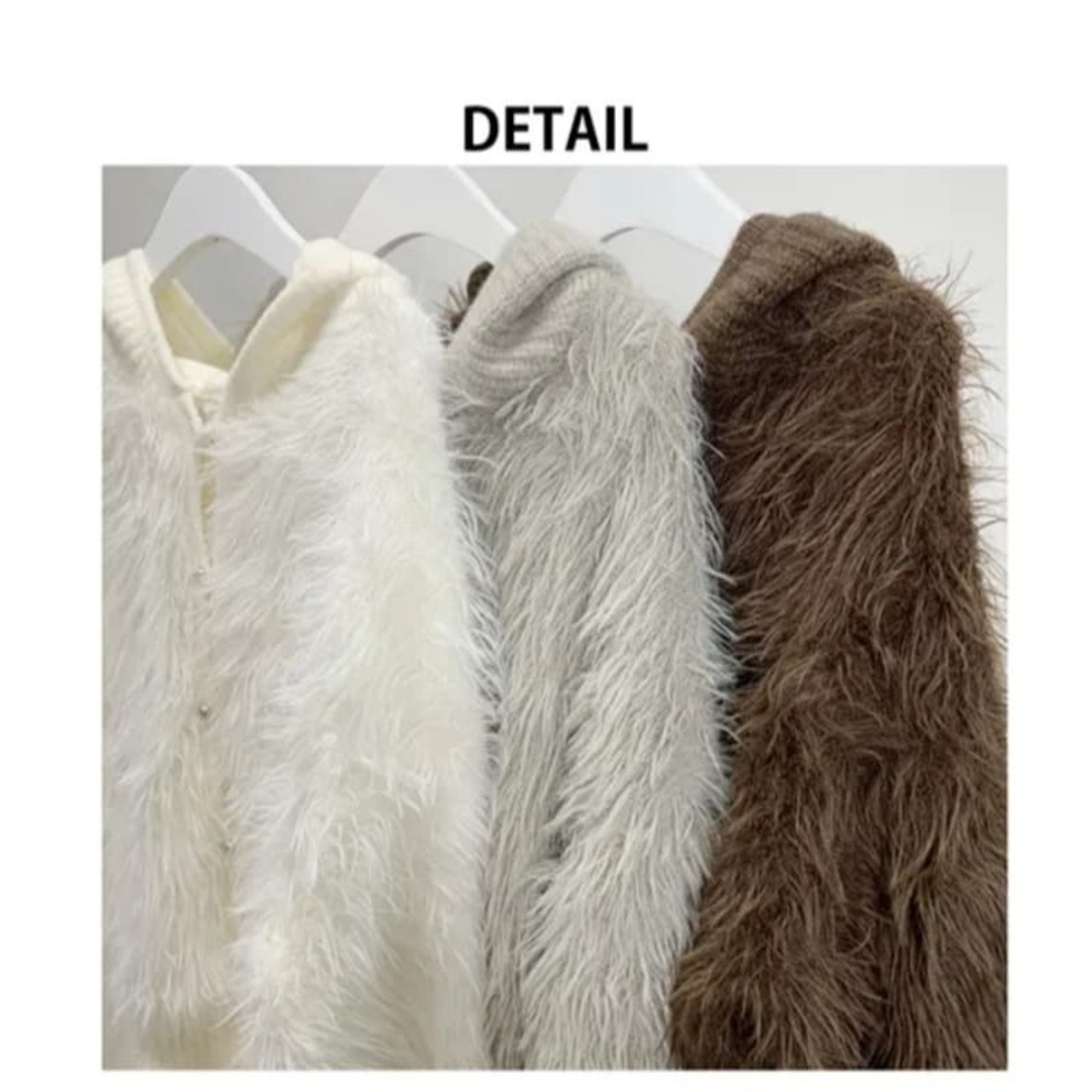 こなれ感とカジュアルさを演出するフード付きシャギーニットカーディガン。