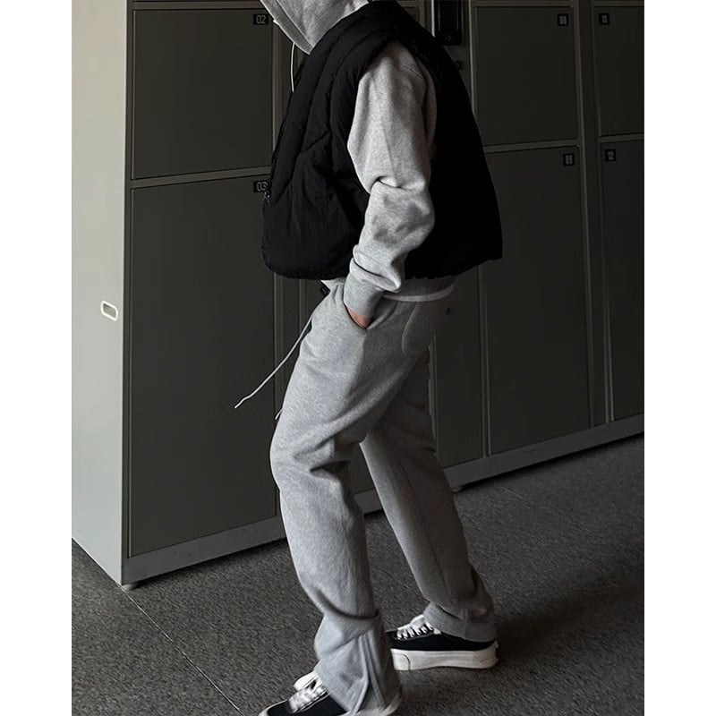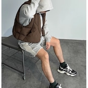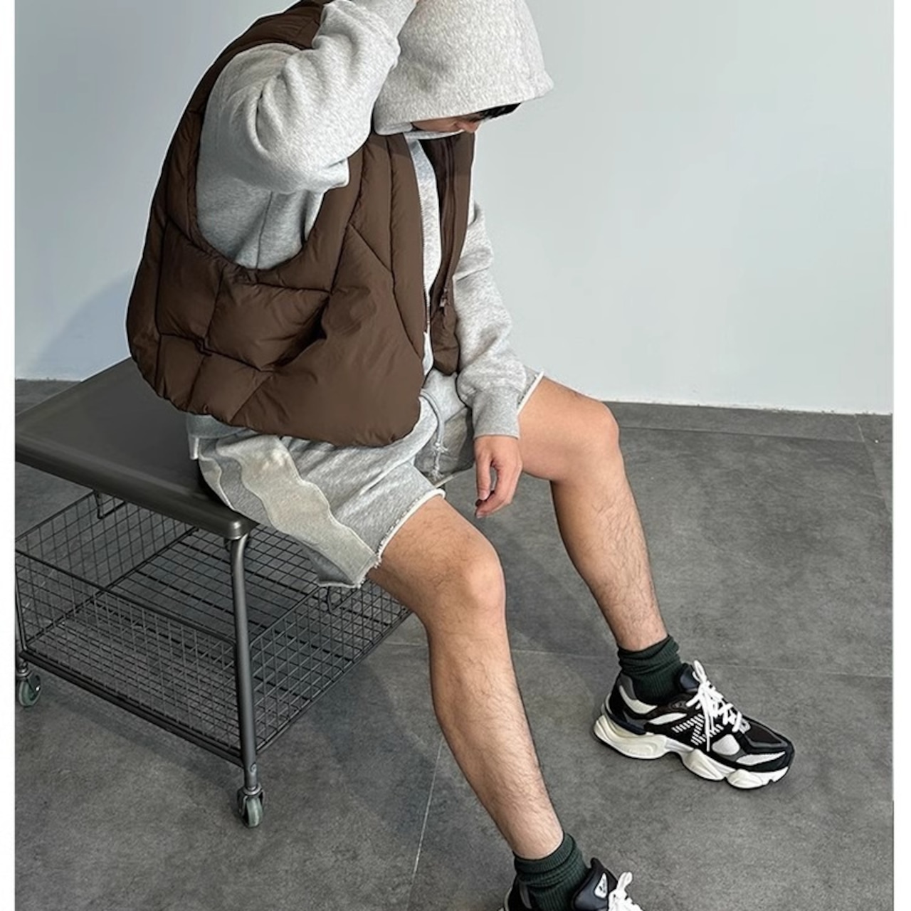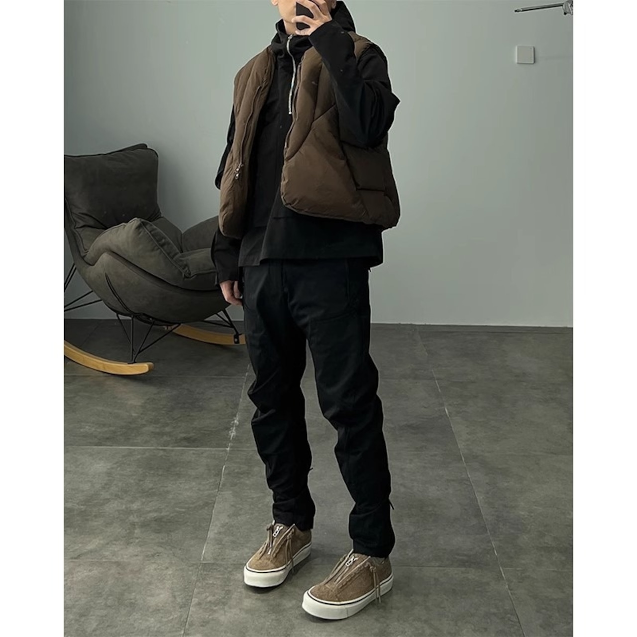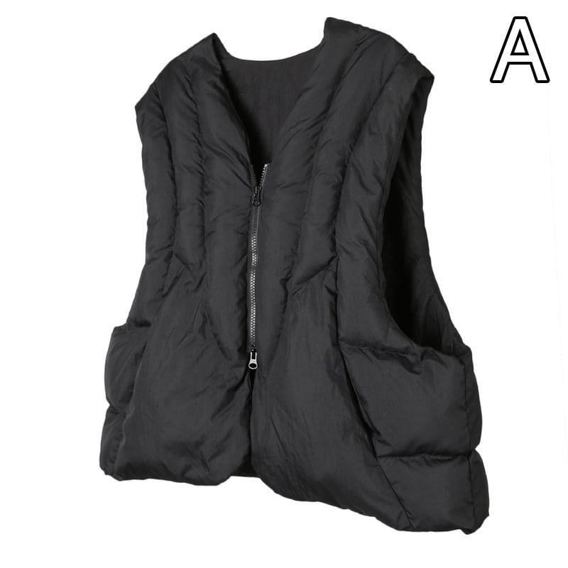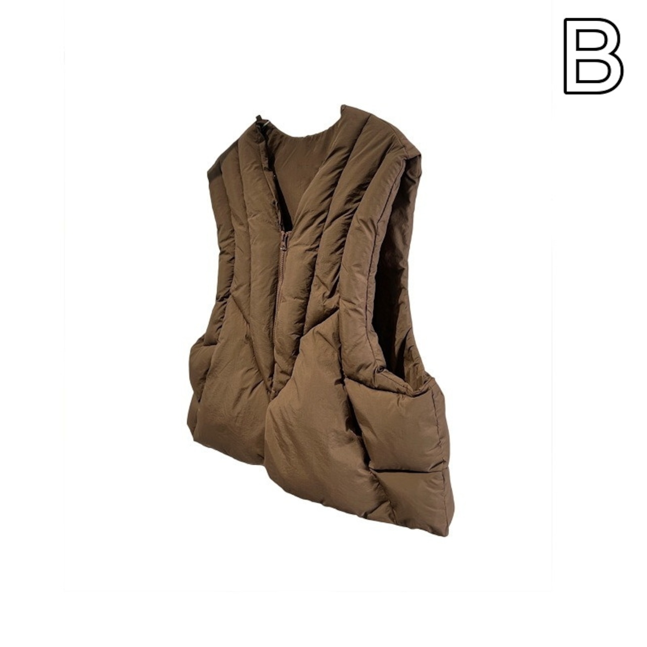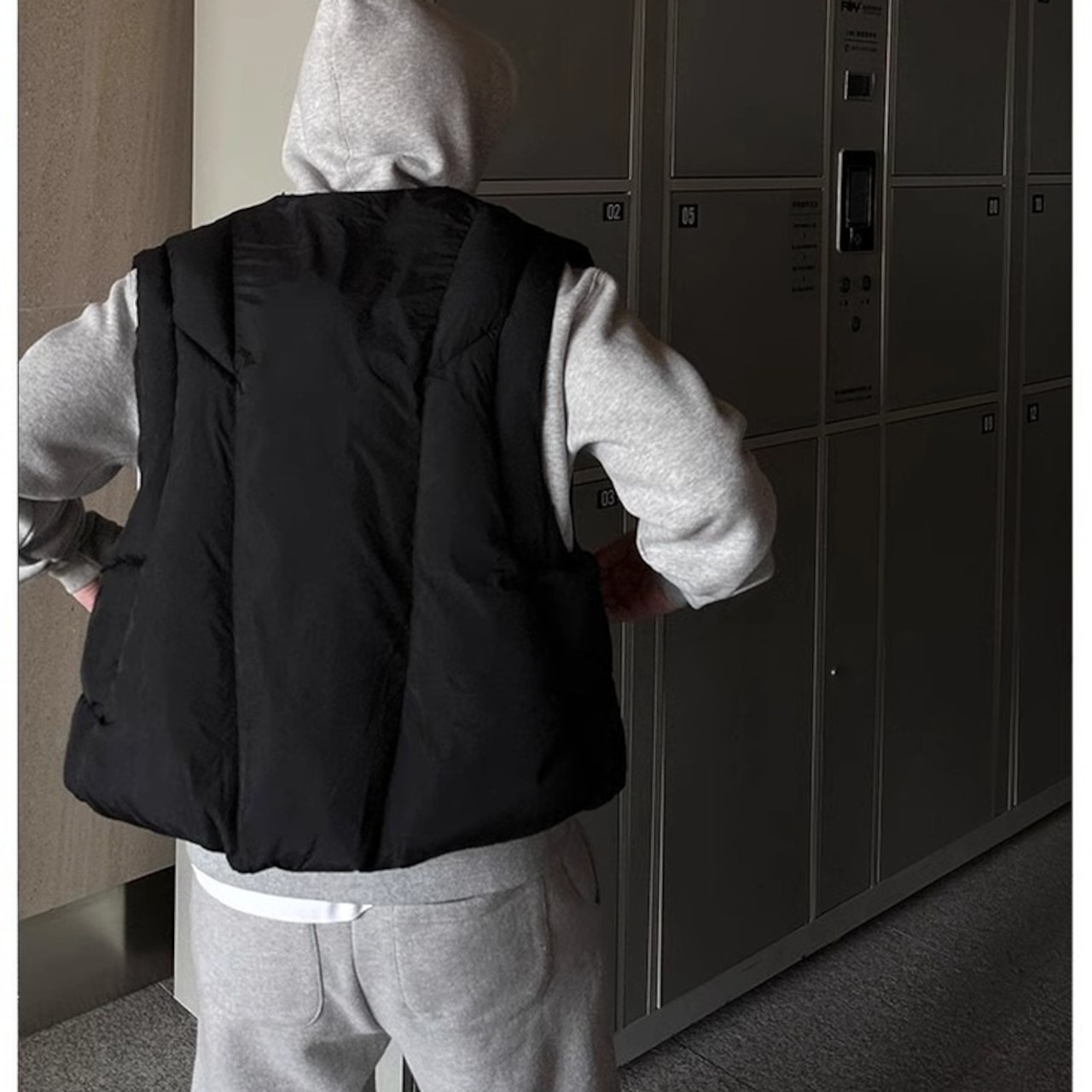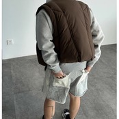 おしゃれで洗練された印象を与えるノーカラー中綿ベスト。