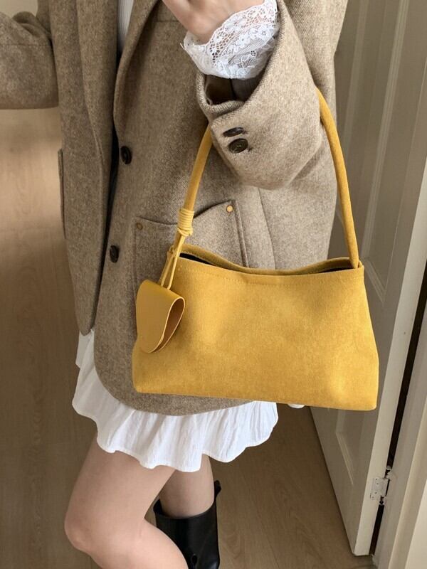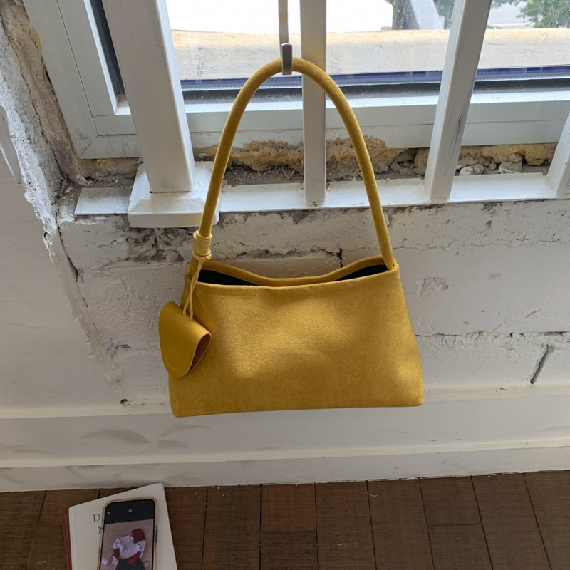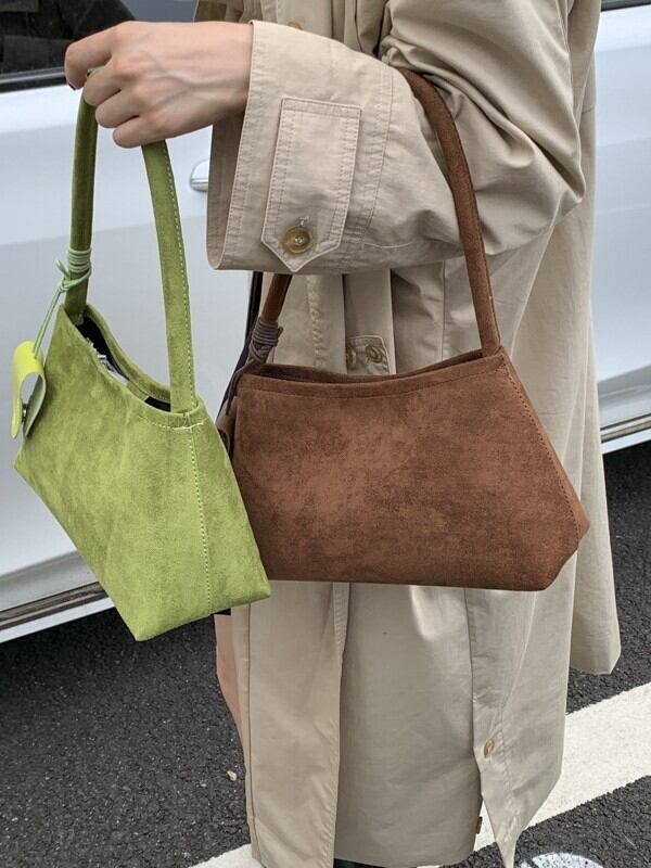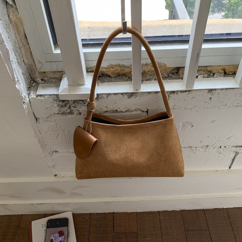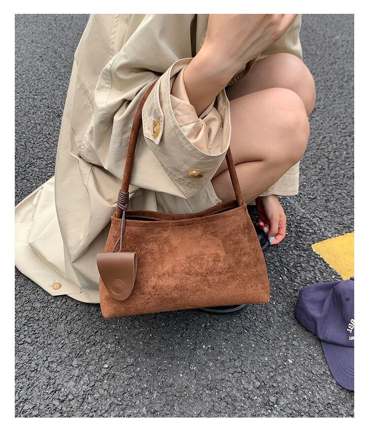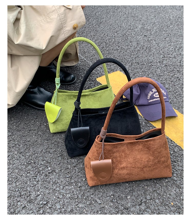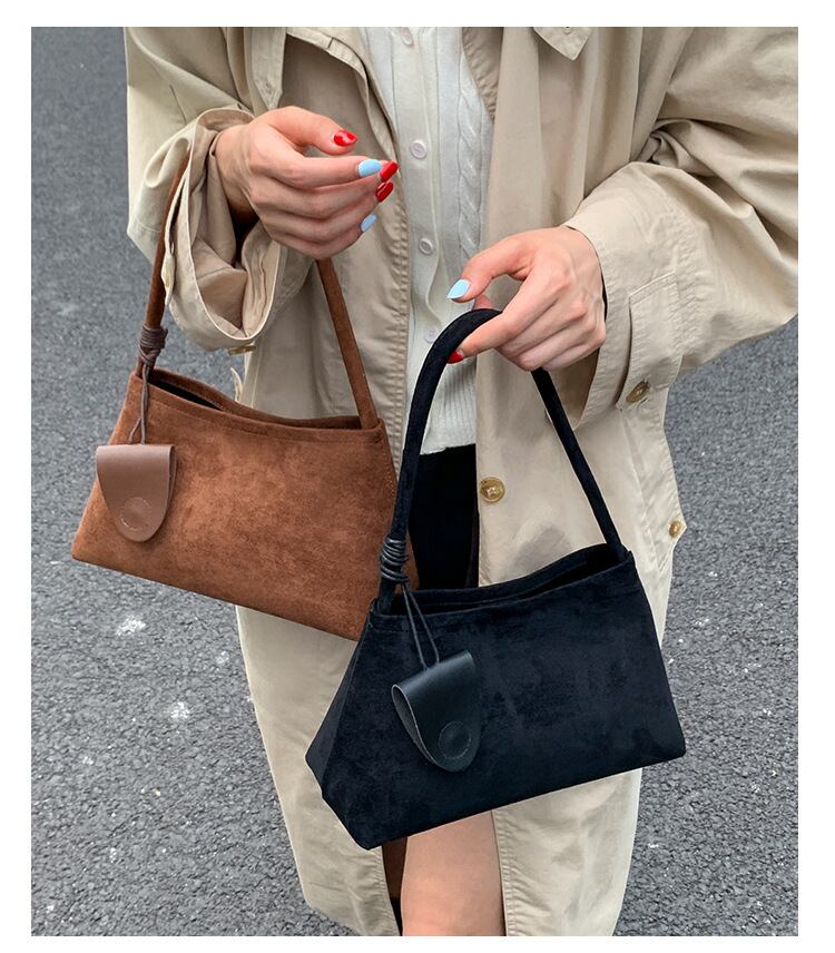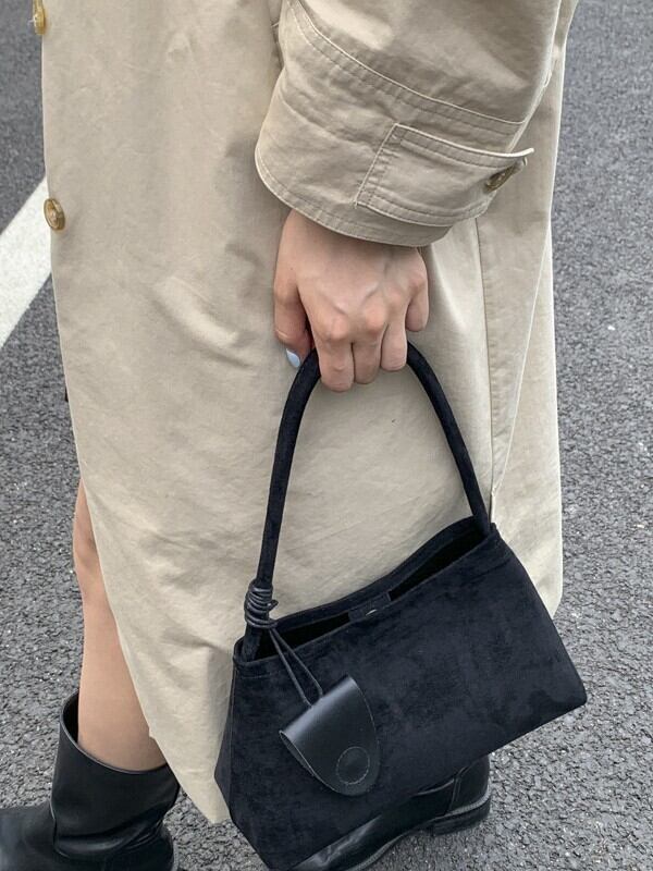 おしゃれで洗練された印象を与えるスエード調ハンドバッグ。