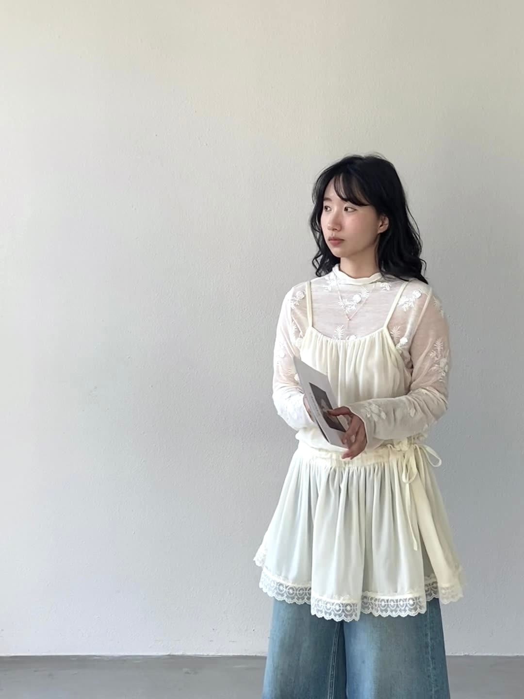 春らしく軽やかな印象を与える刺繍トップス&シアーキャミワンピのセットアップ。