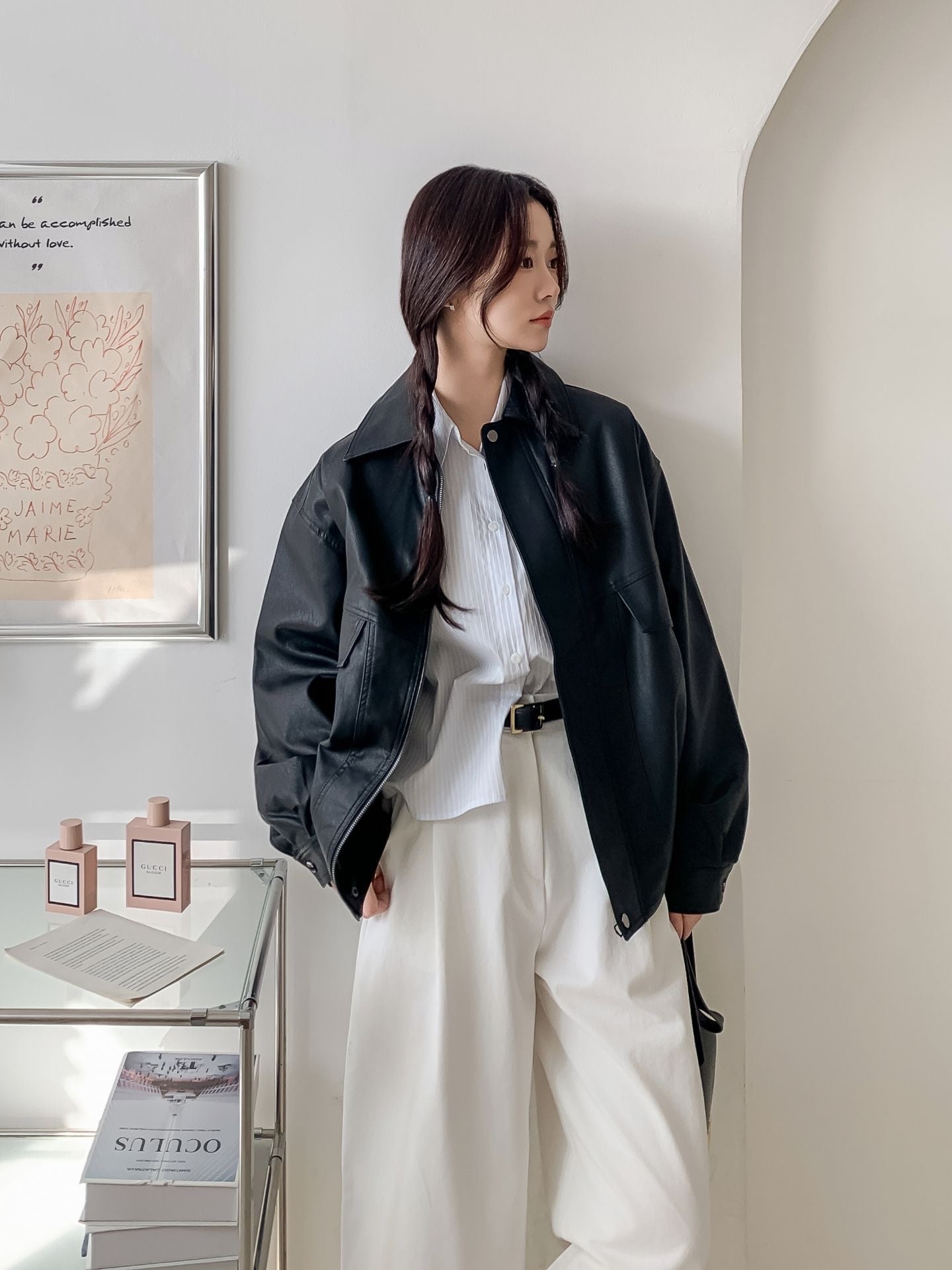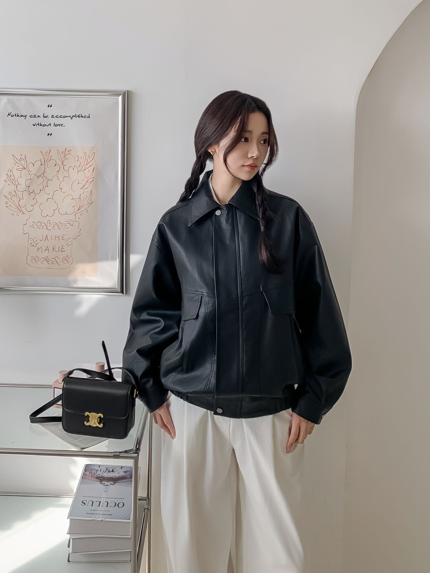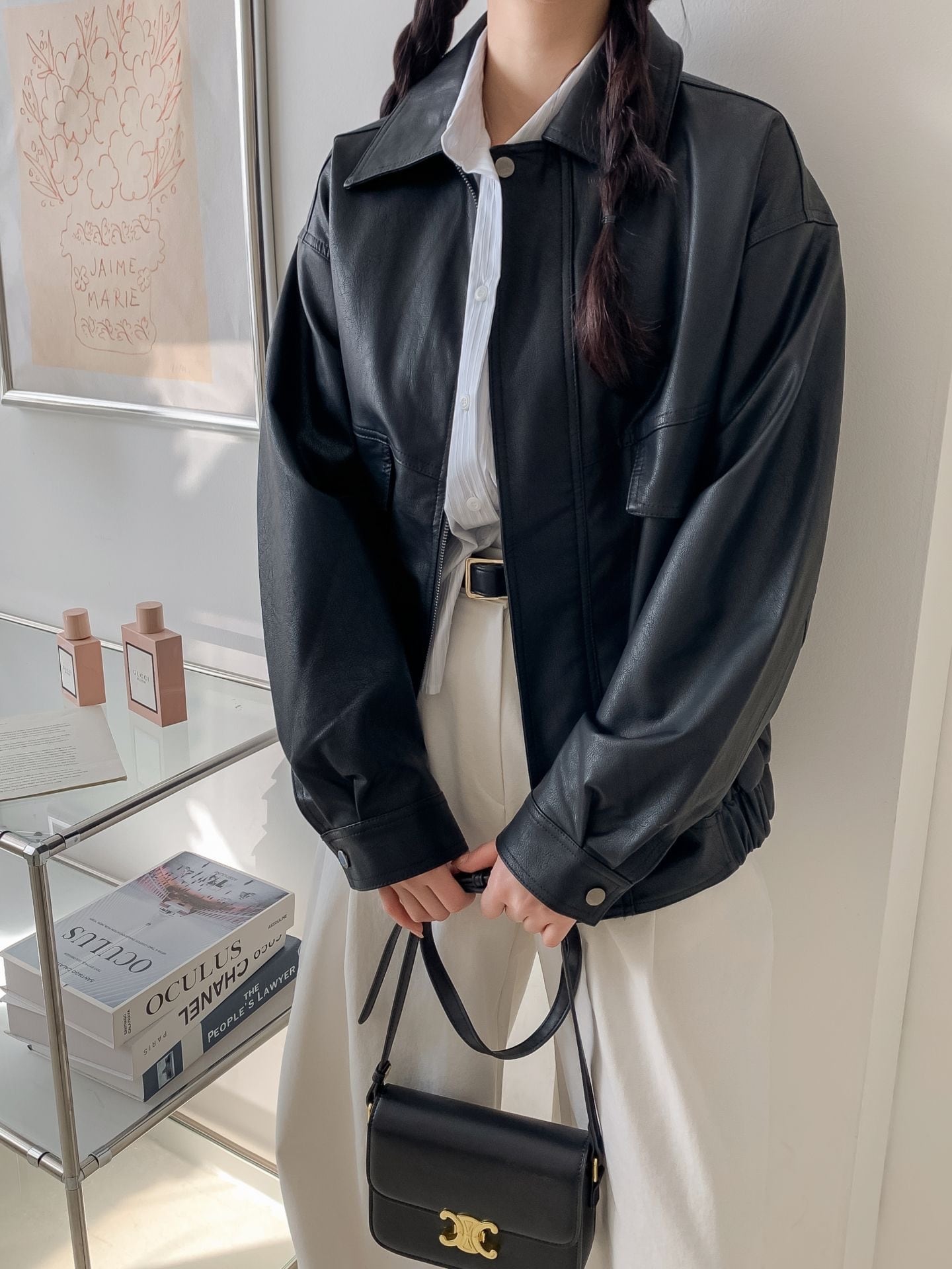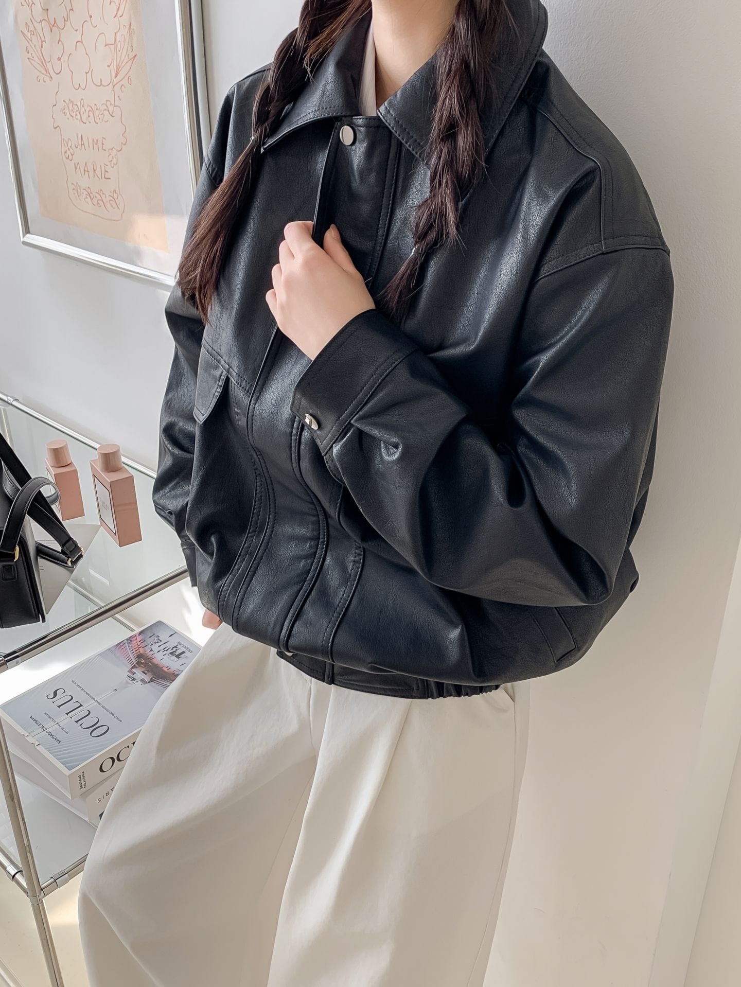 シンプルでこなれ感のあるデザインが魅力のフェイクレザージャケット。