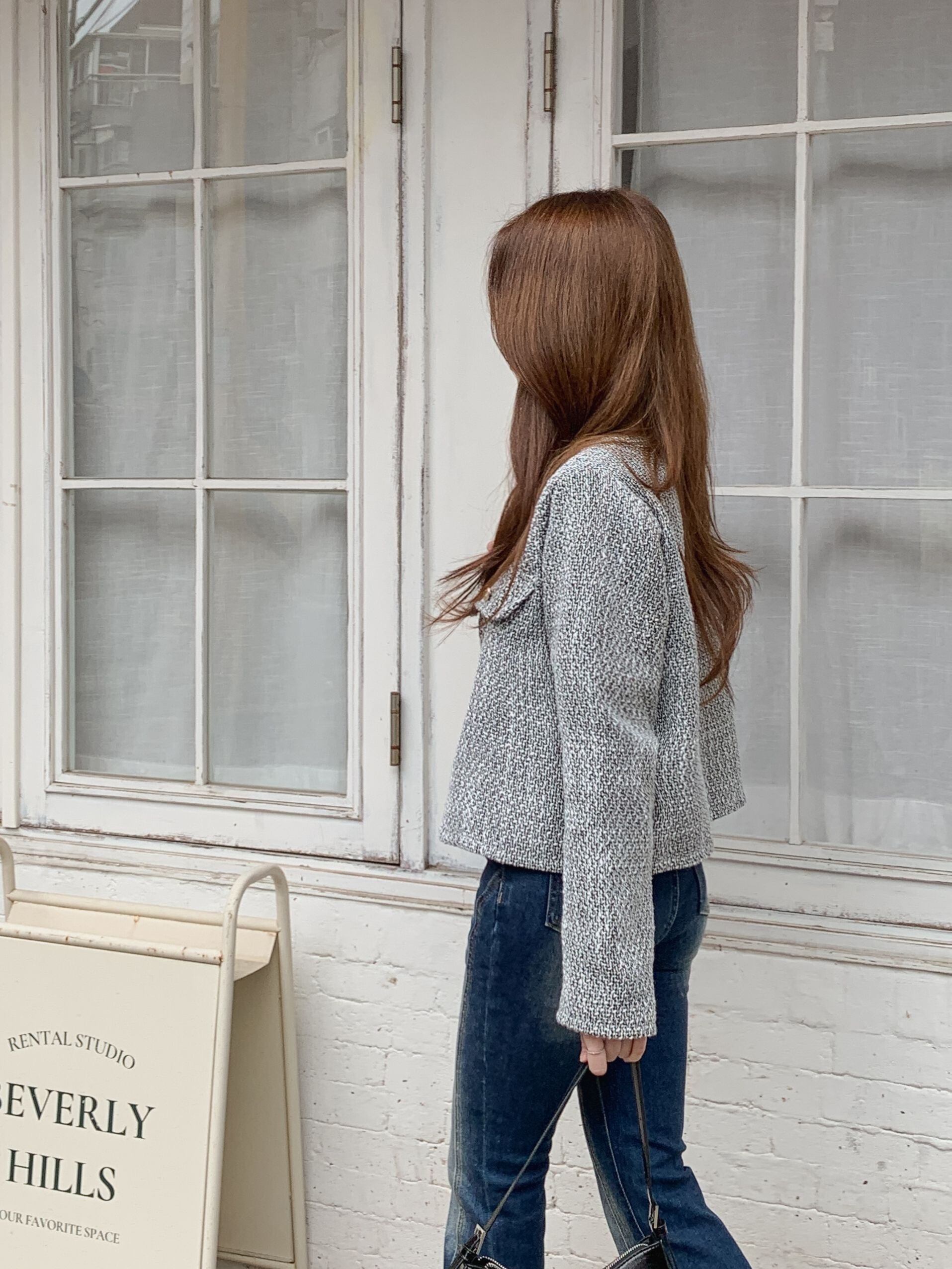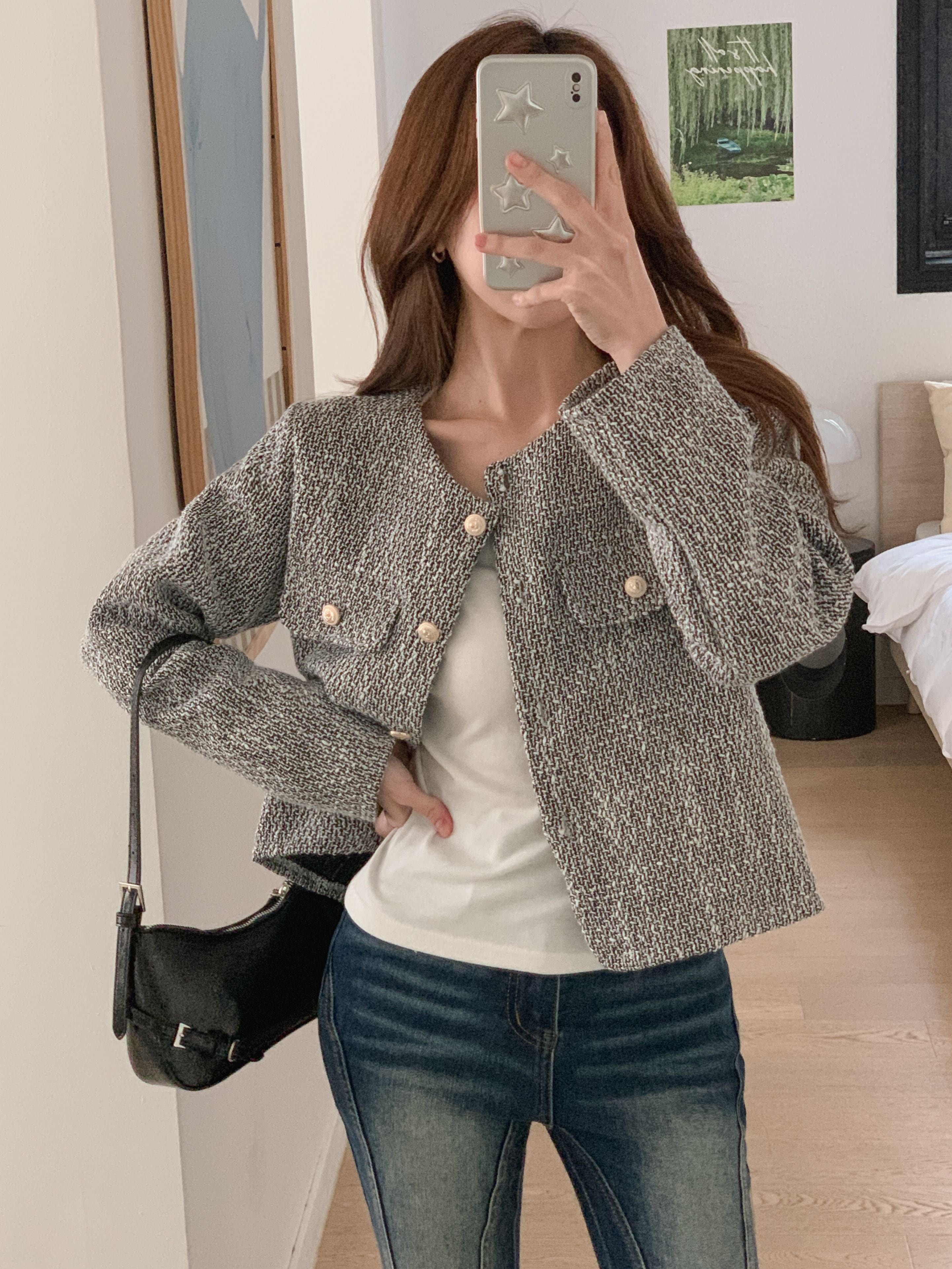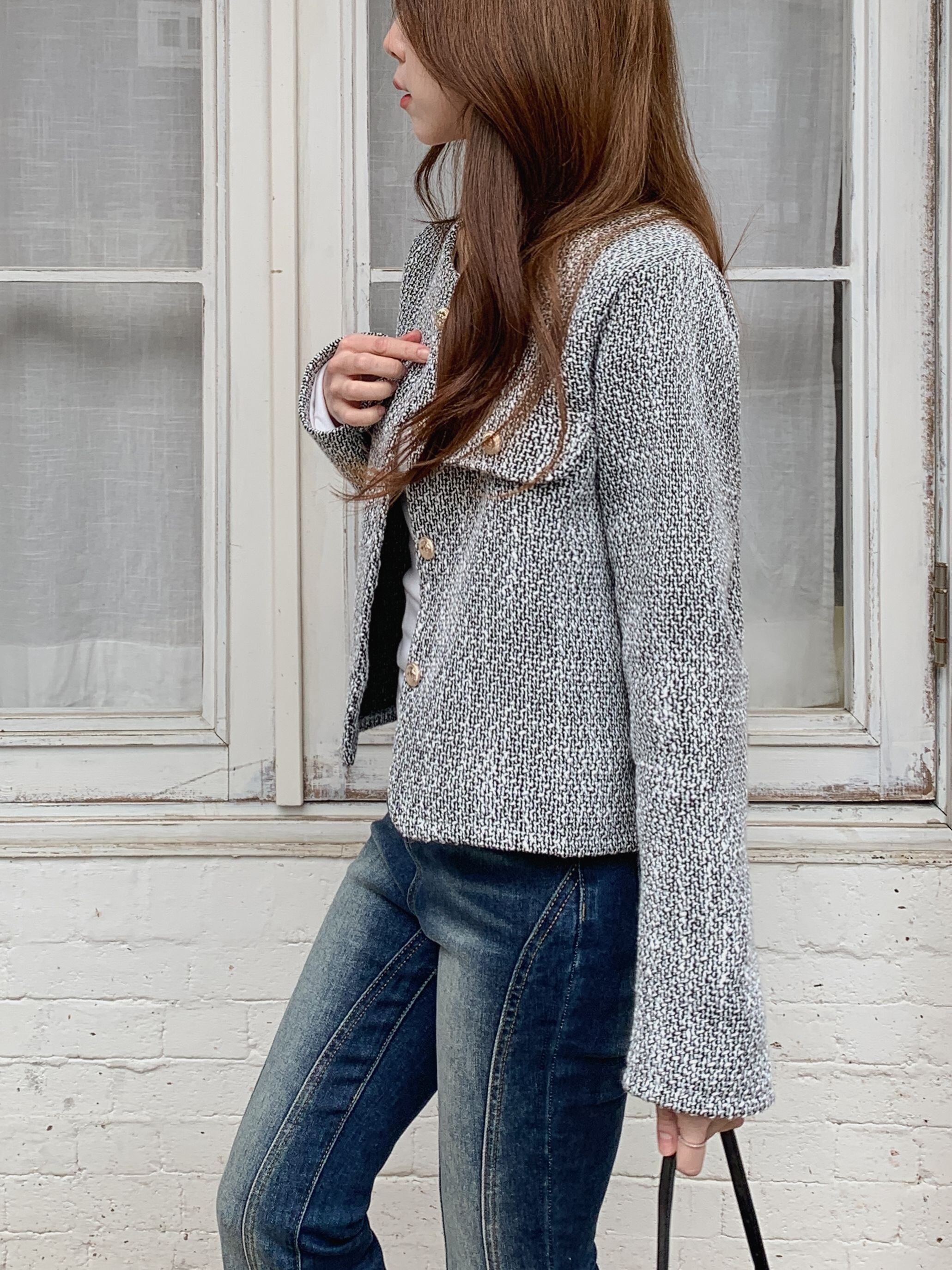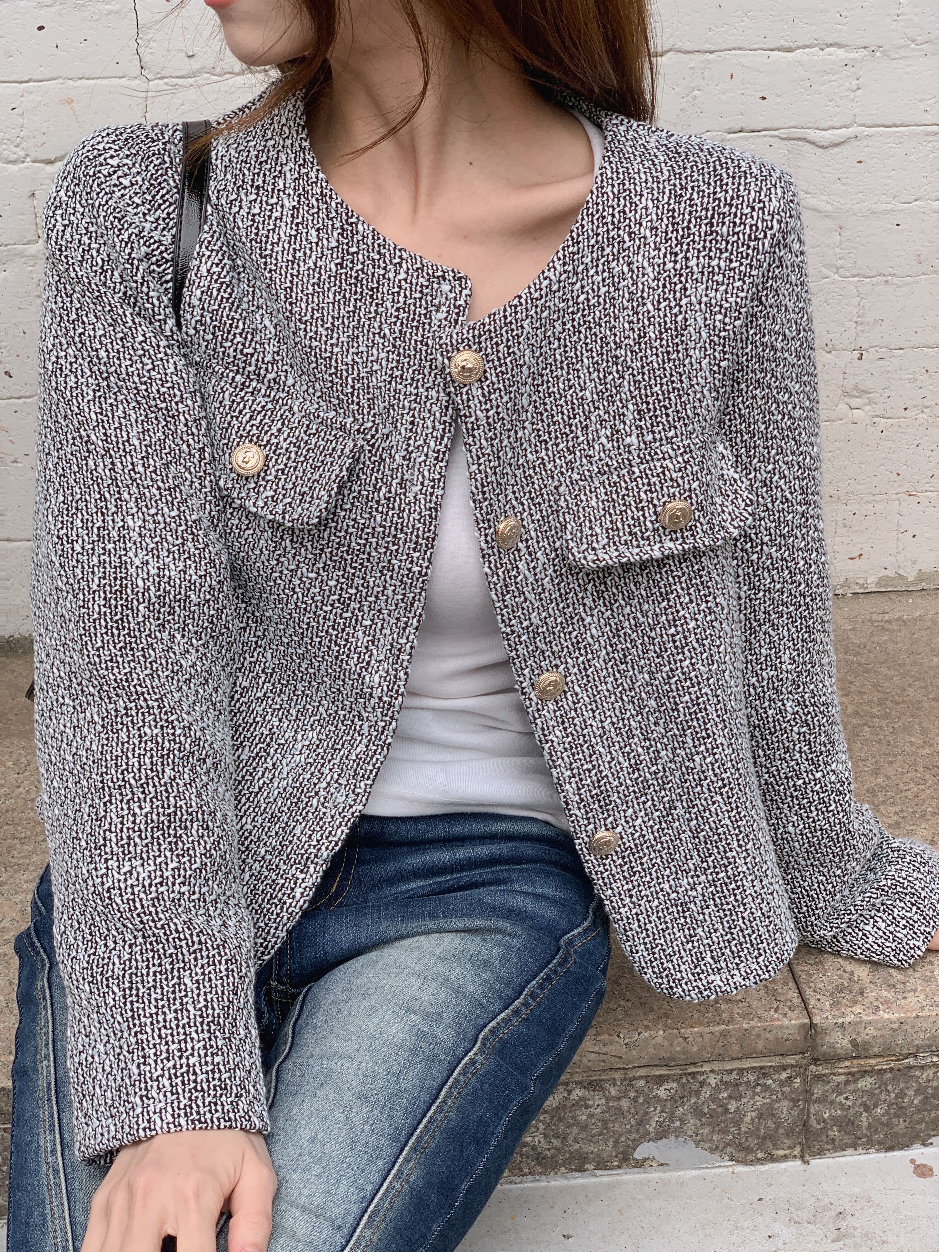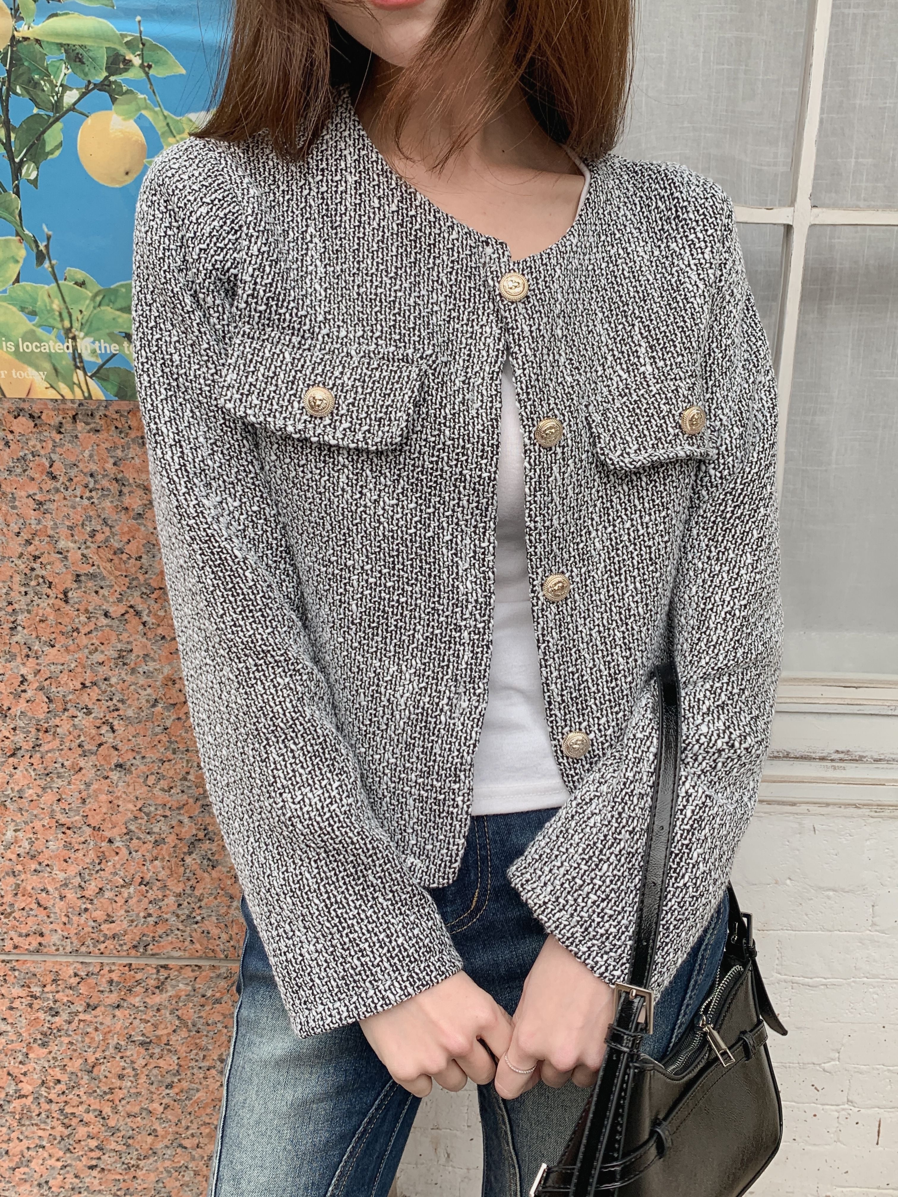 柔らかなツイード生地が、高級感と着心地の良さを兼ね備え、多様なスタイルにフィットするデザインです。