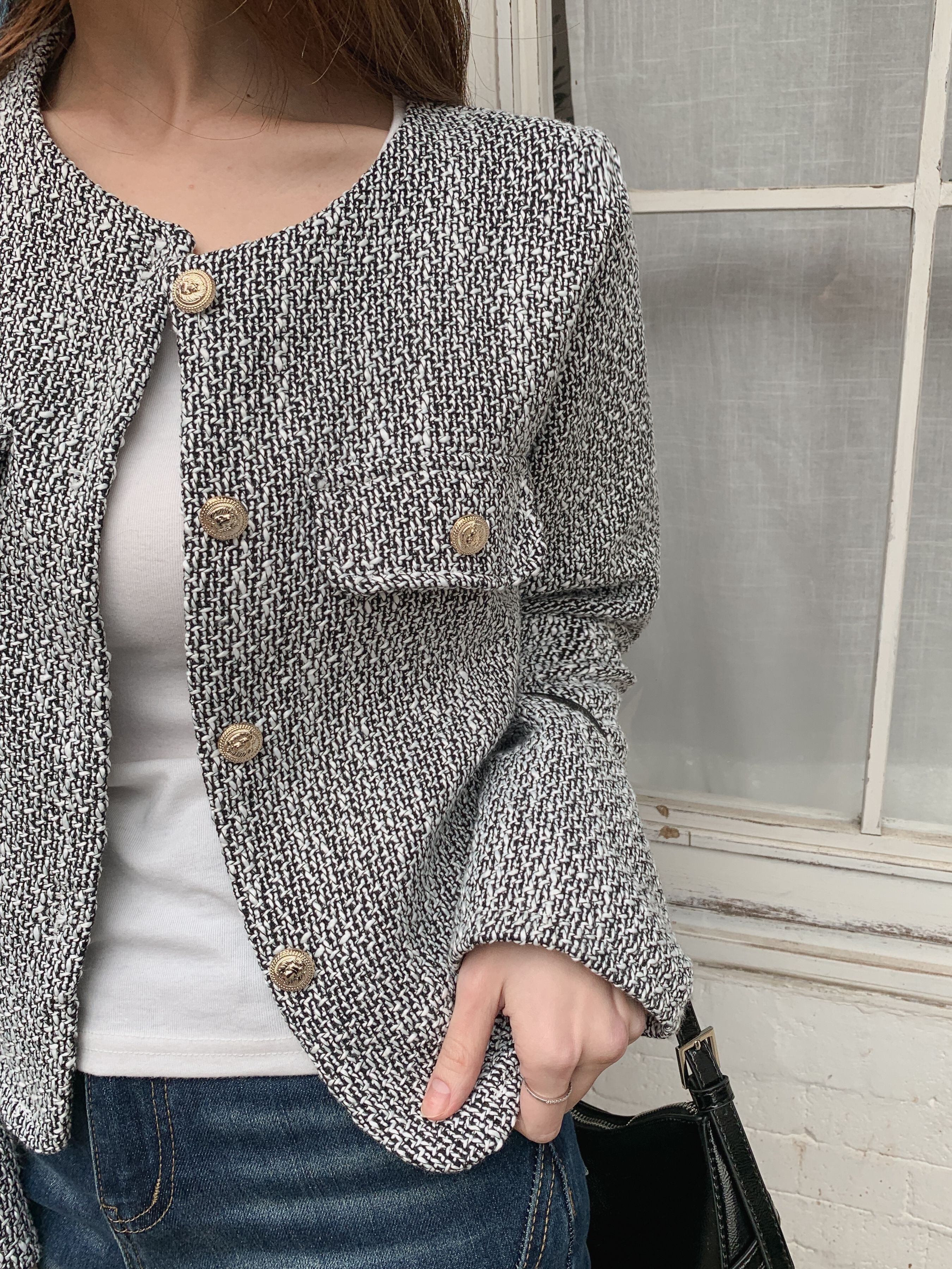 シックで上品な印象を与えるツイードジャケット。