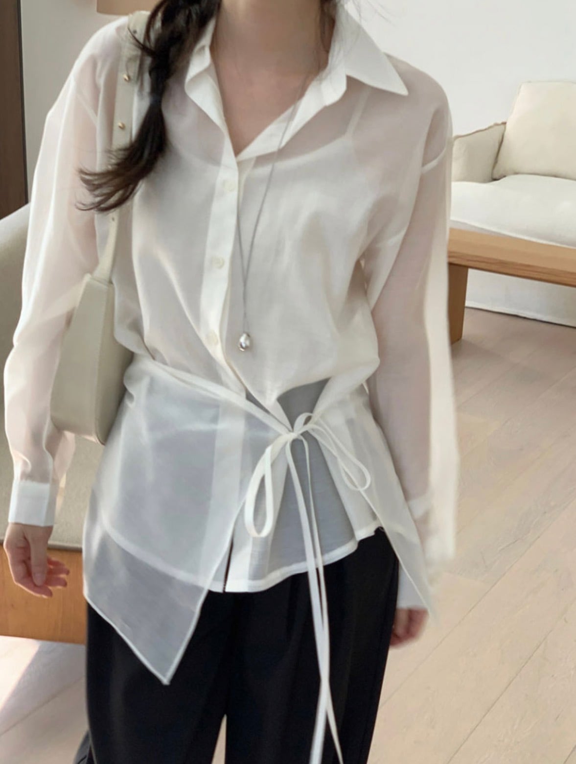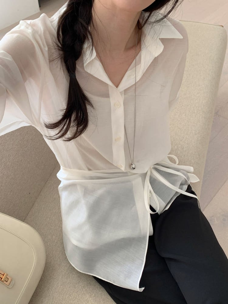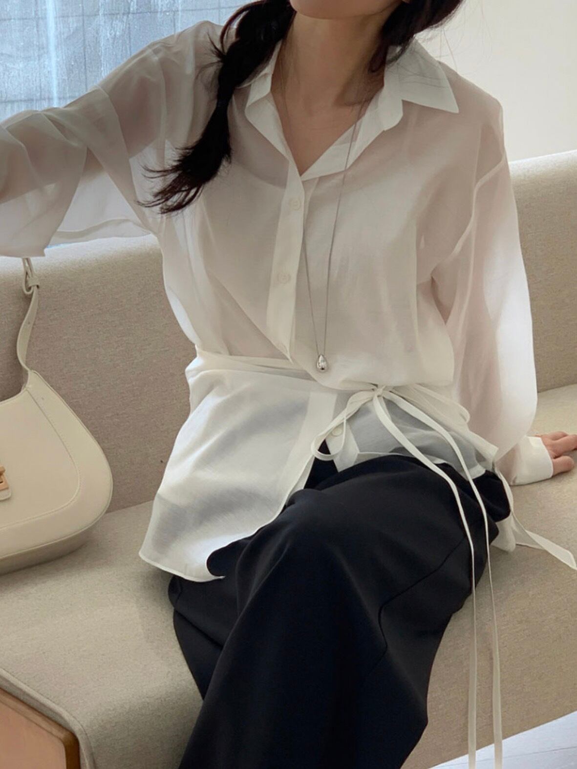 シンプルでありながらも大人っぽさを演出するホワイトシアーシャツ。