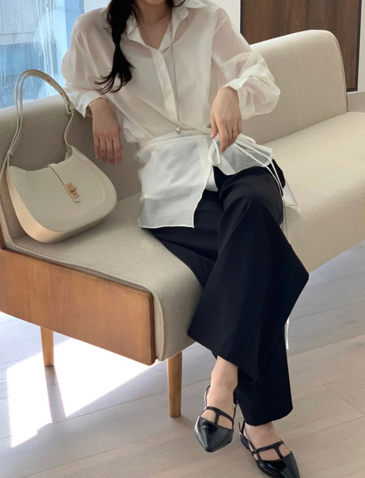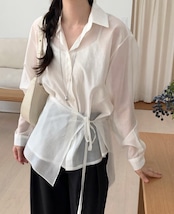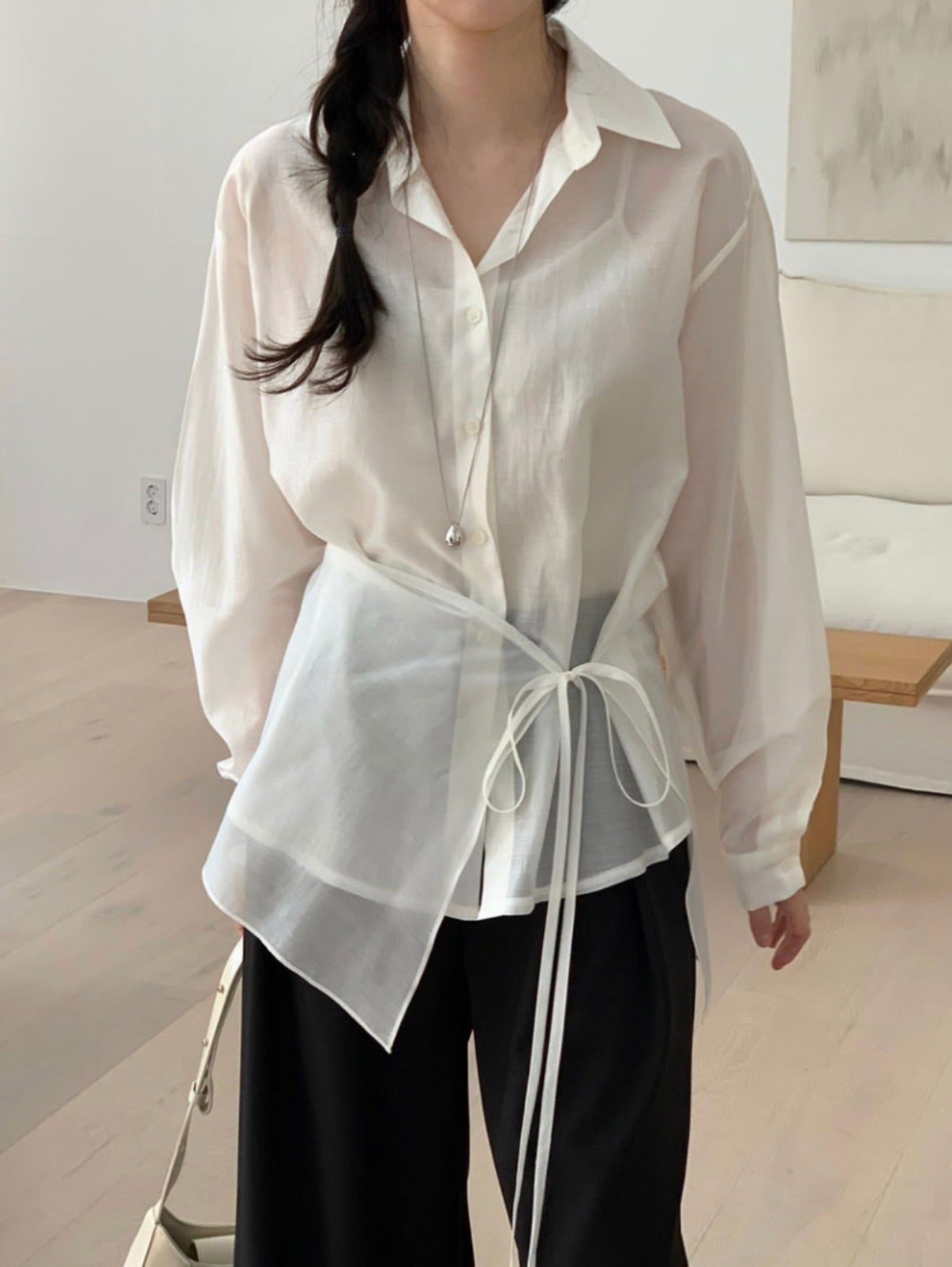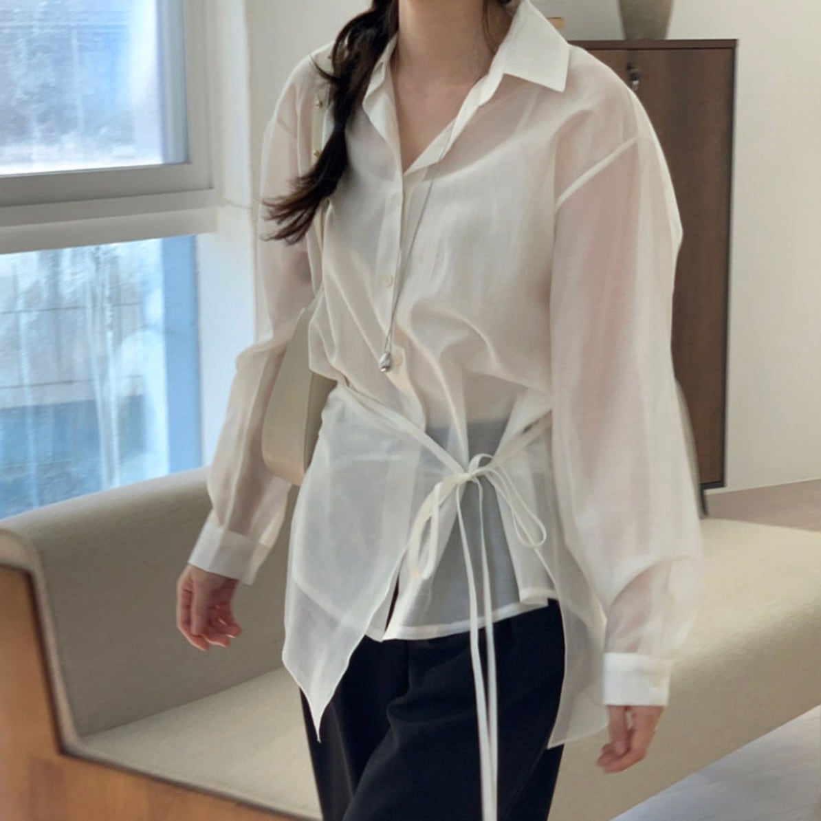 シンプルでありながらも大人っぽさを演出するホワイトシアーシャツ。