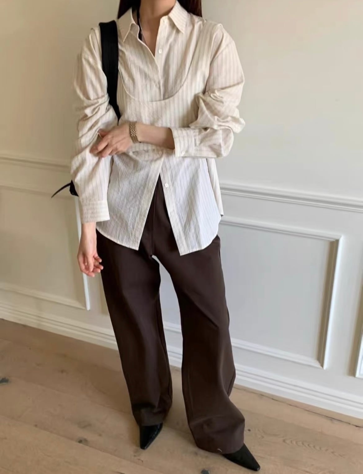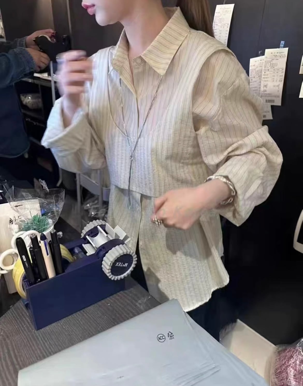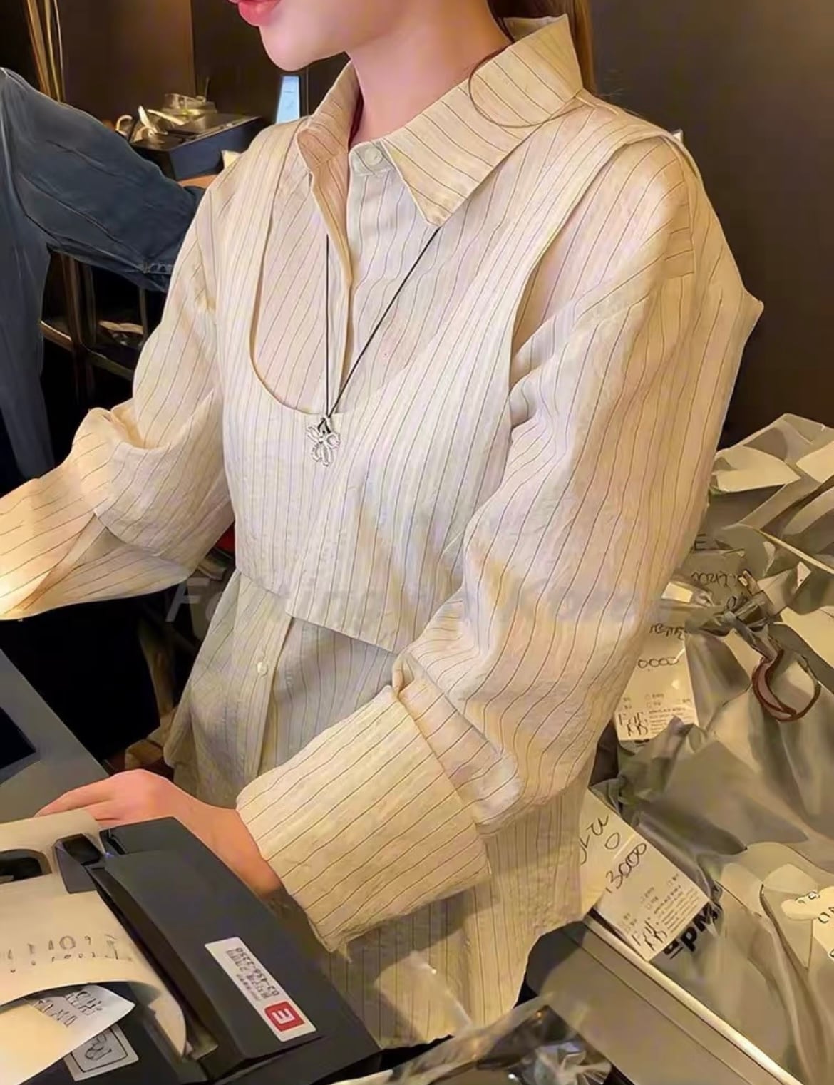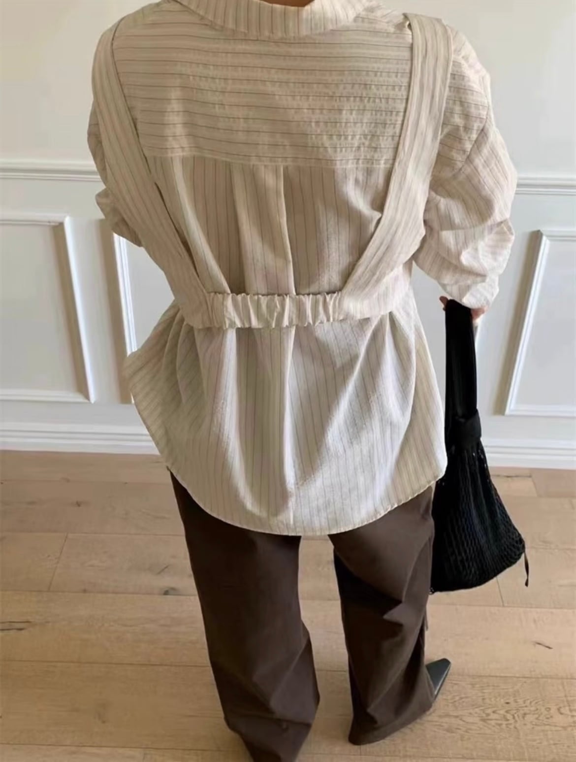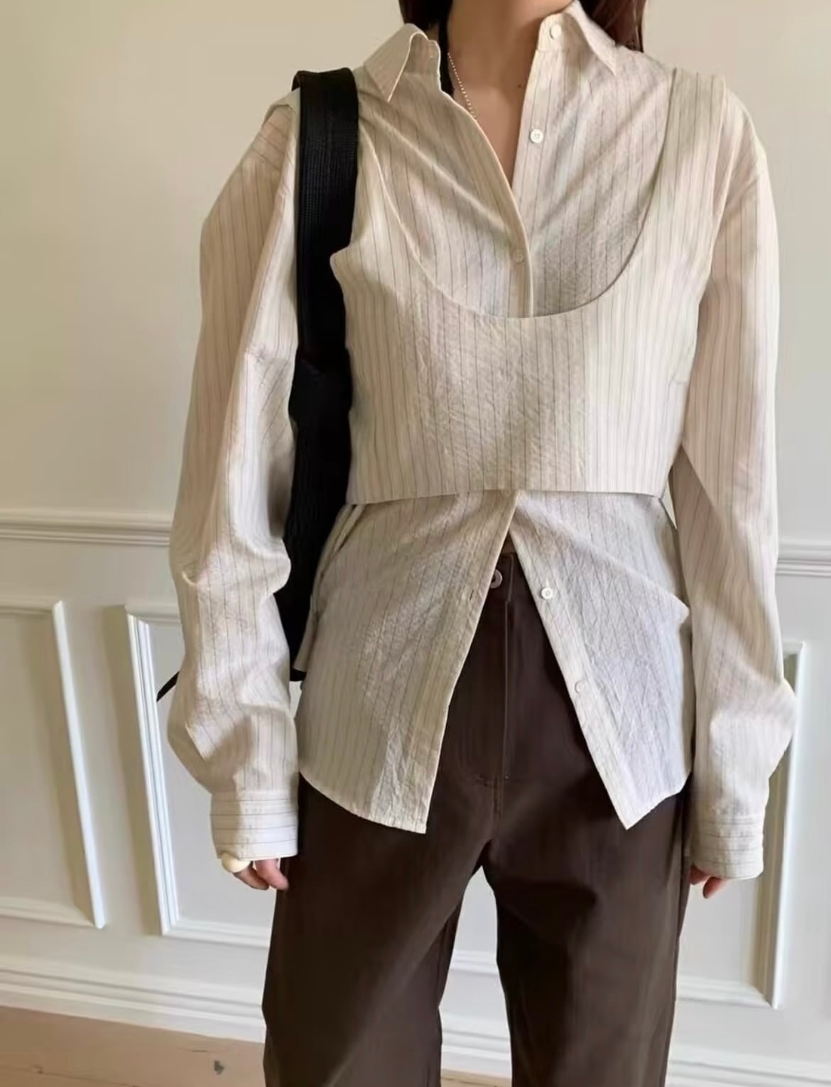 個性的なデザインが魅力的なビスチェ付きストライプシャツ。