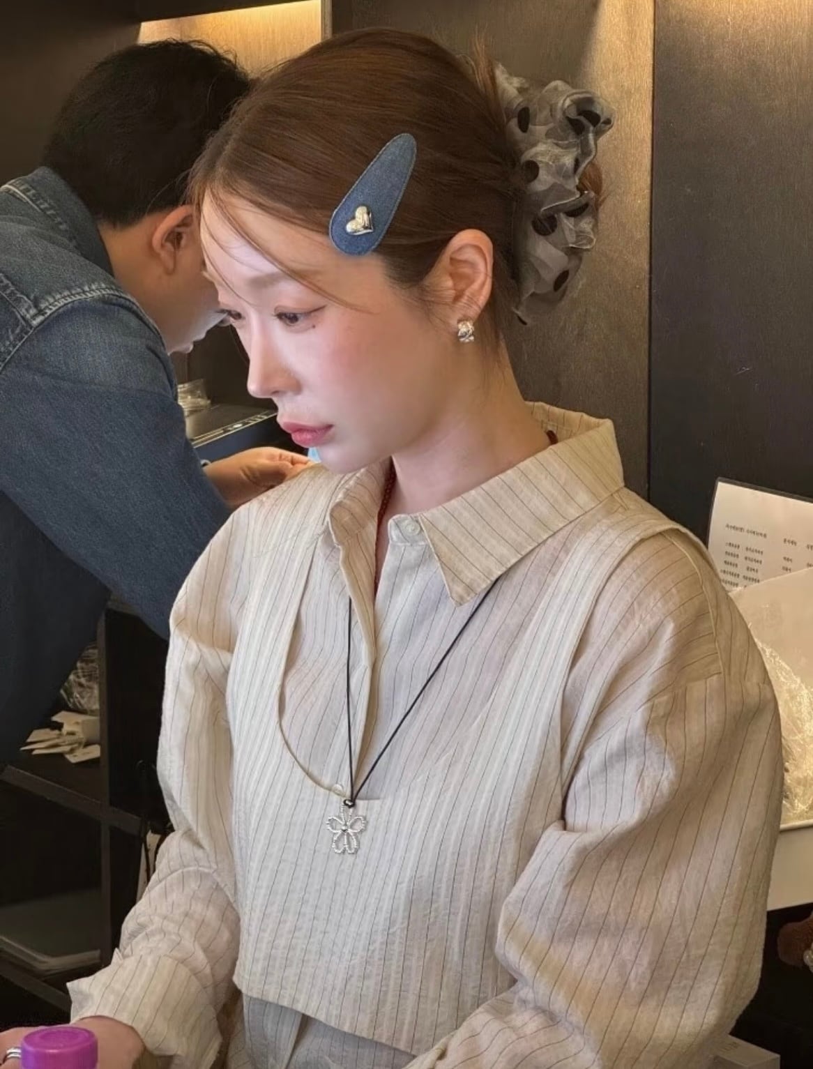 ストライプ柄とビスチェの組み合わせにより、シンプルながらも存在感のある雰囲気を醸し出します。