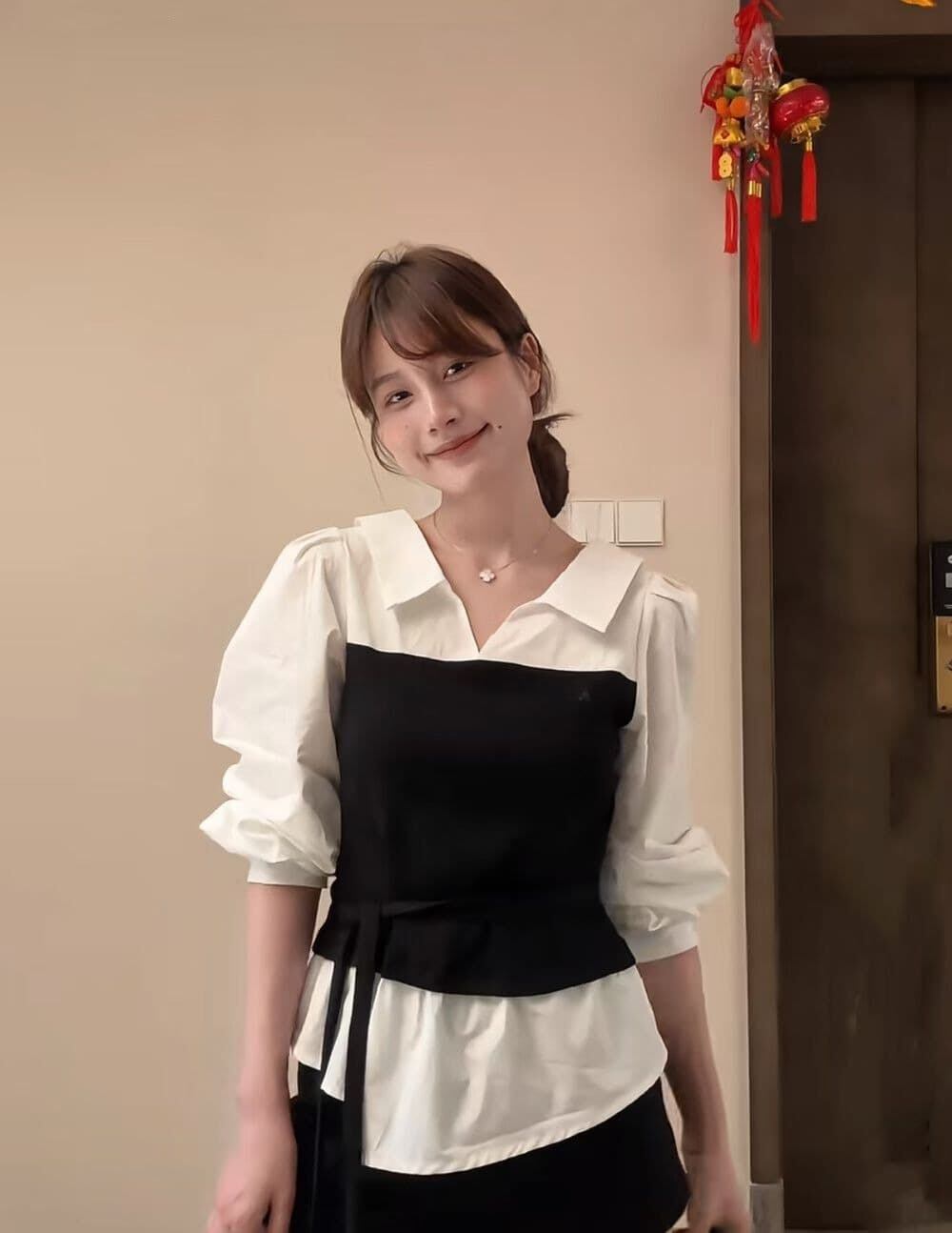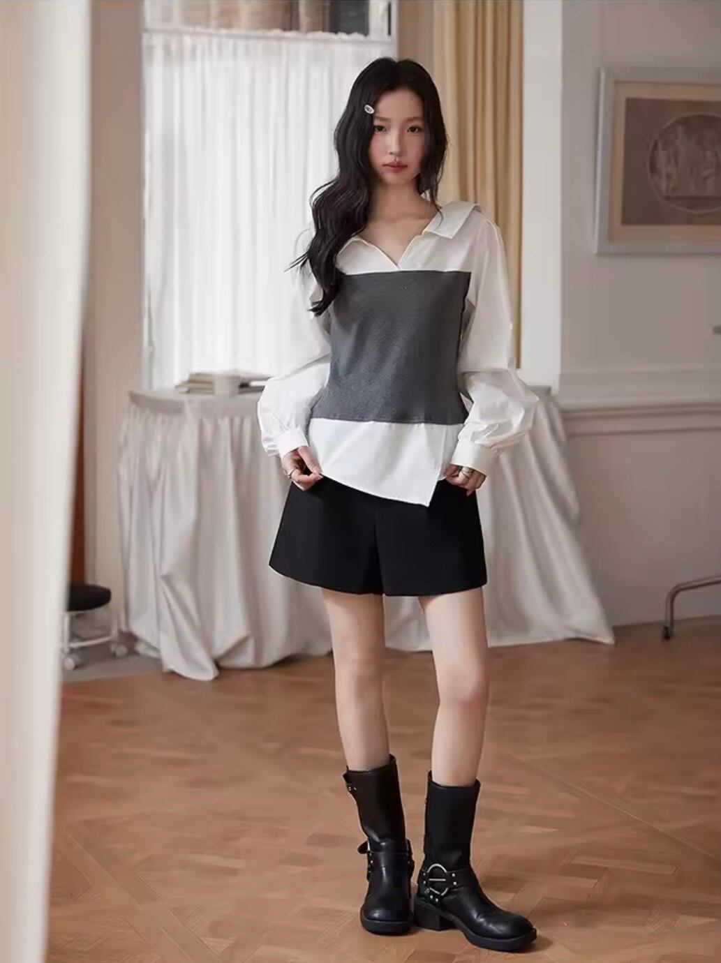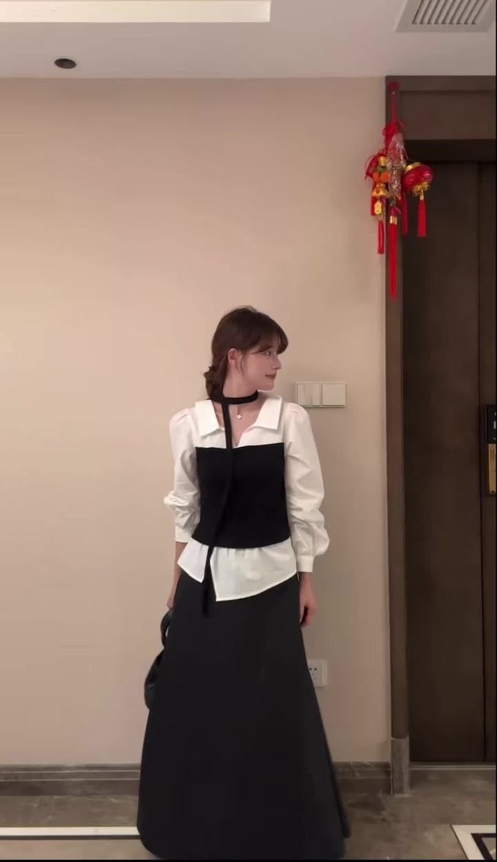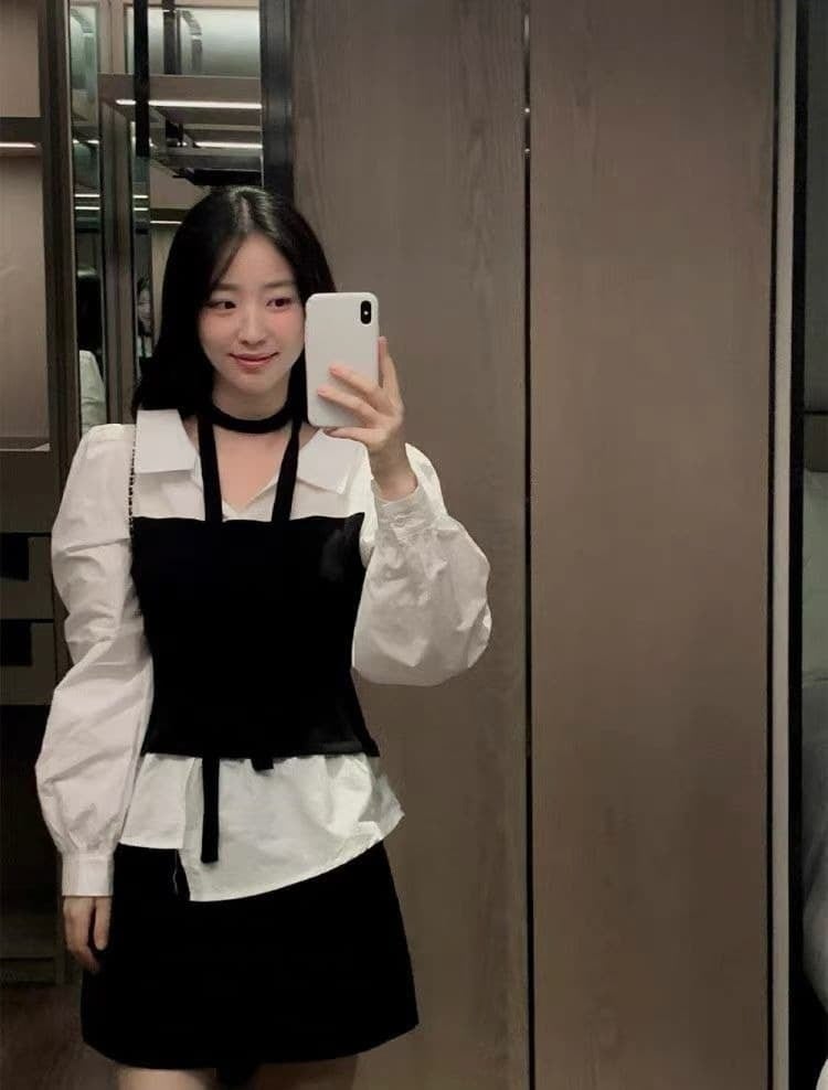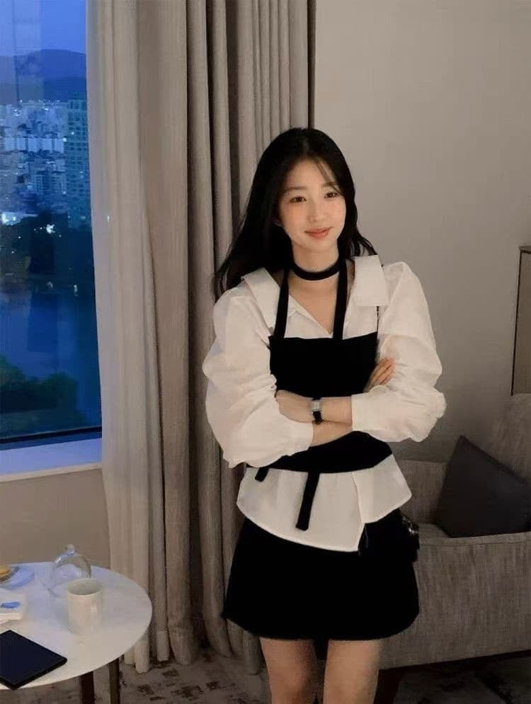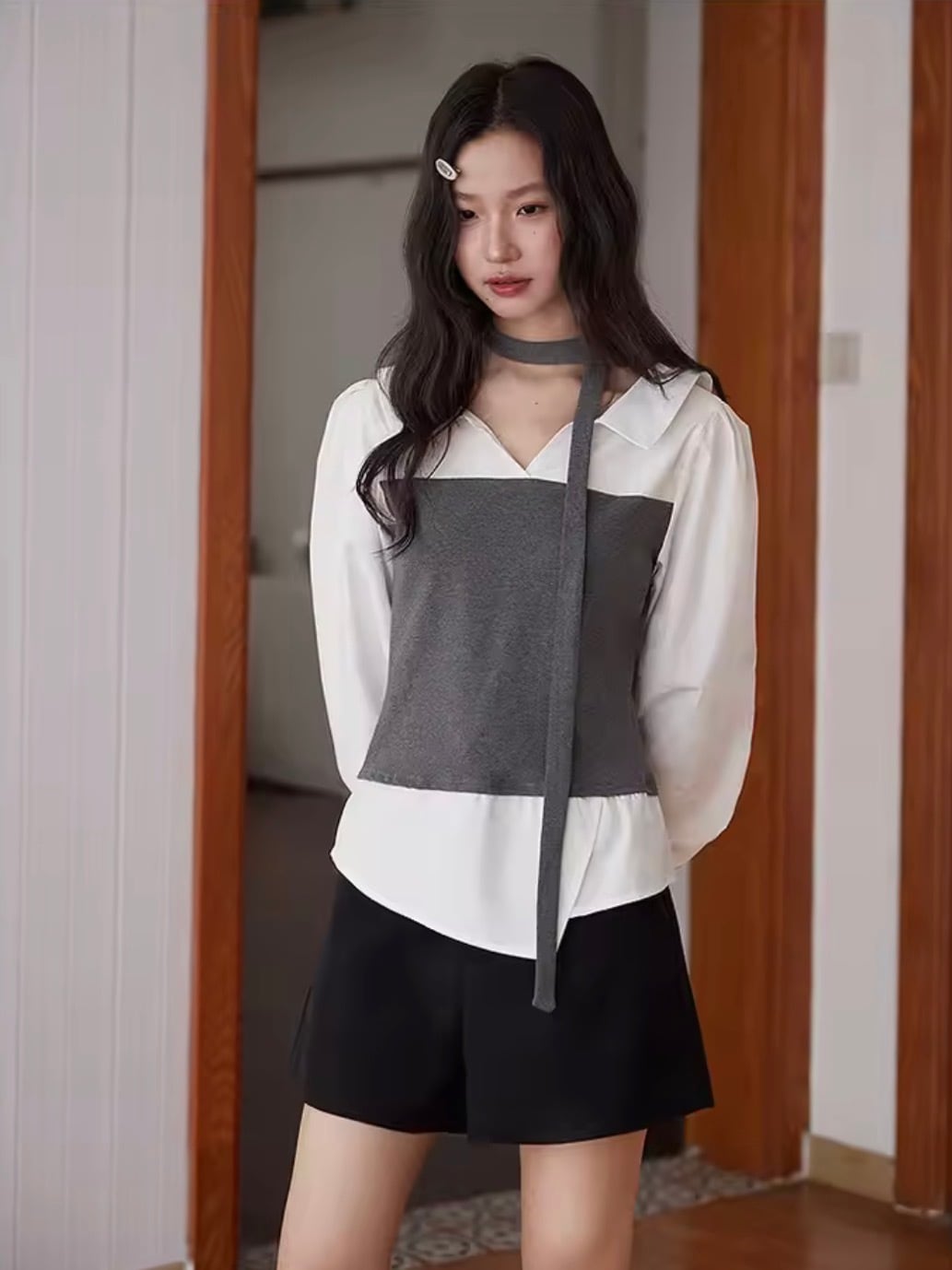 上品で洗練された印象を与えるチョーカー付きレイヤード風シャツ。