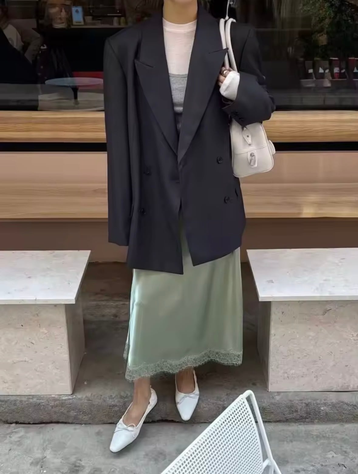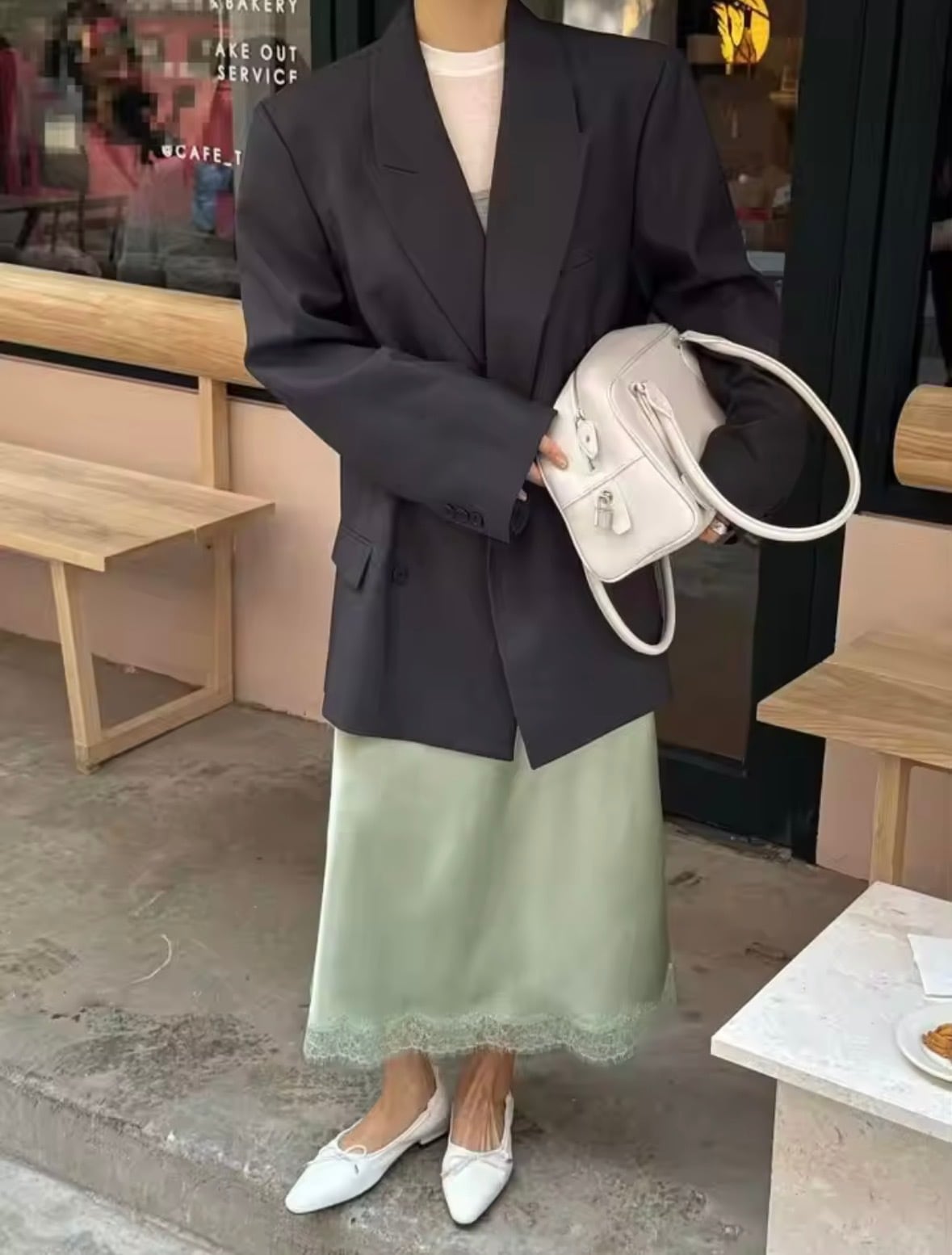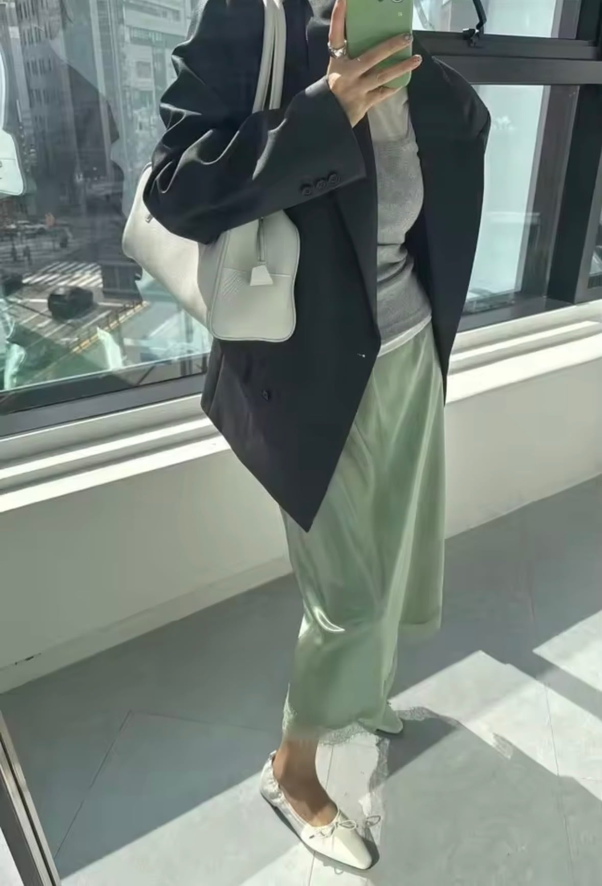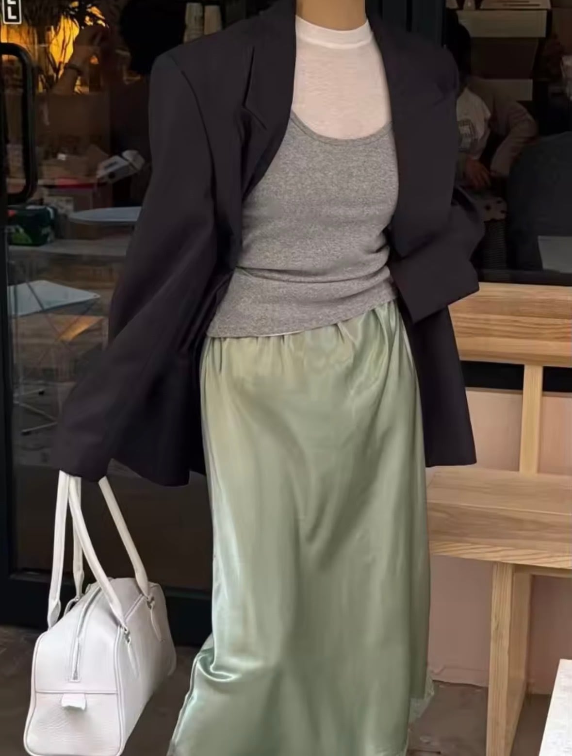 サテン素材が軽やかでエレガントな印象を与え、日常使いから特別な日のコーディネートまで幅広く活躍します。