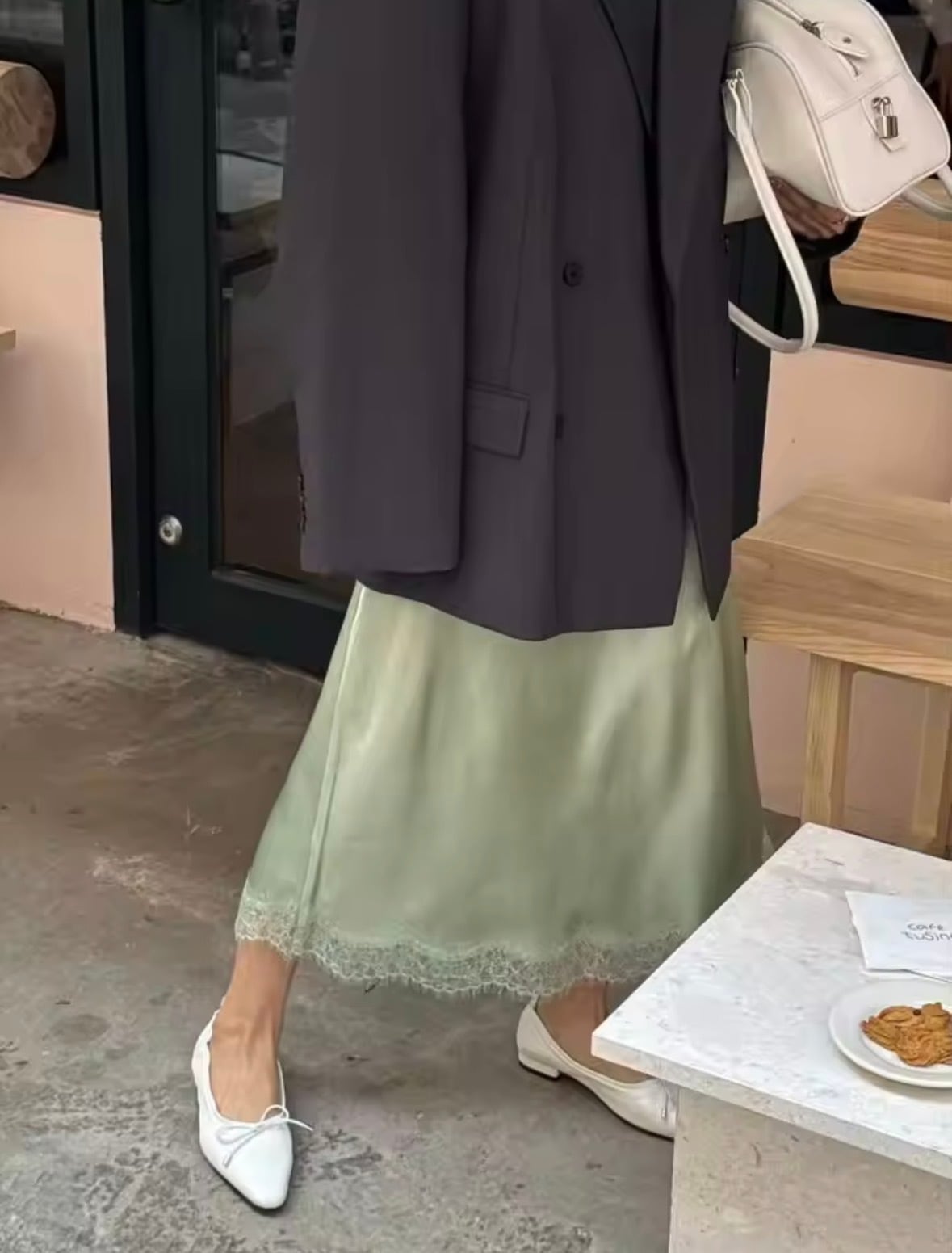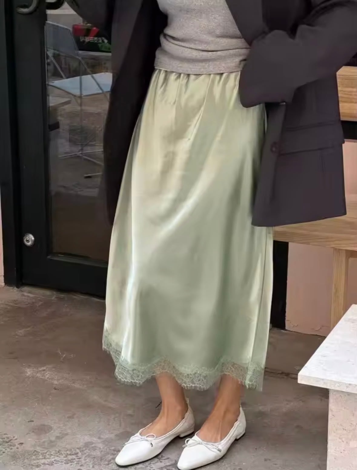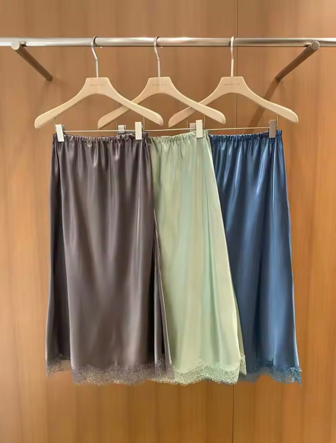 キレイめカジュアルなスタイルを演出してくれるレースサテンスカート。