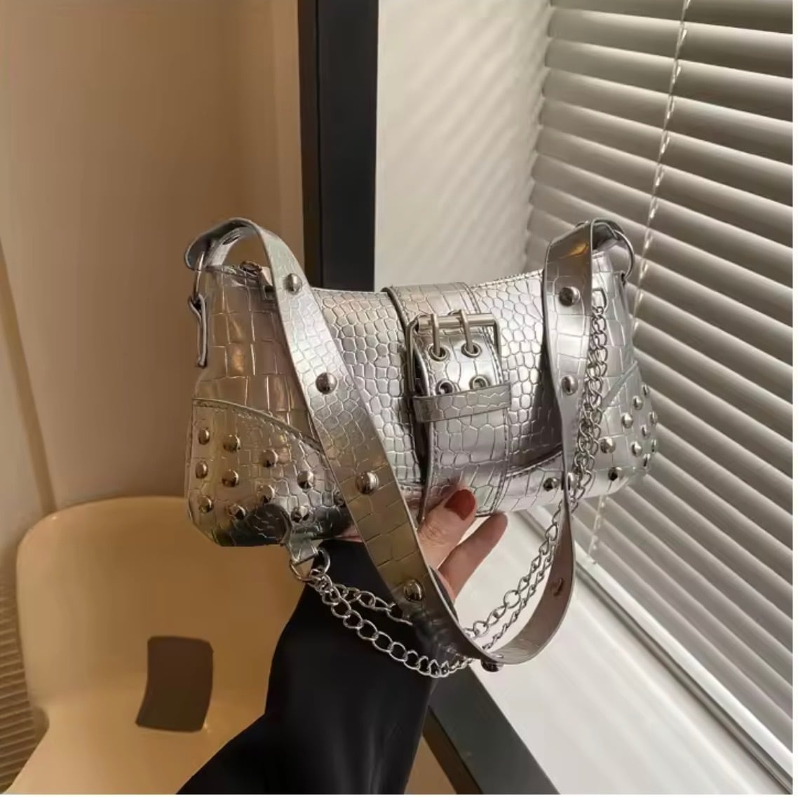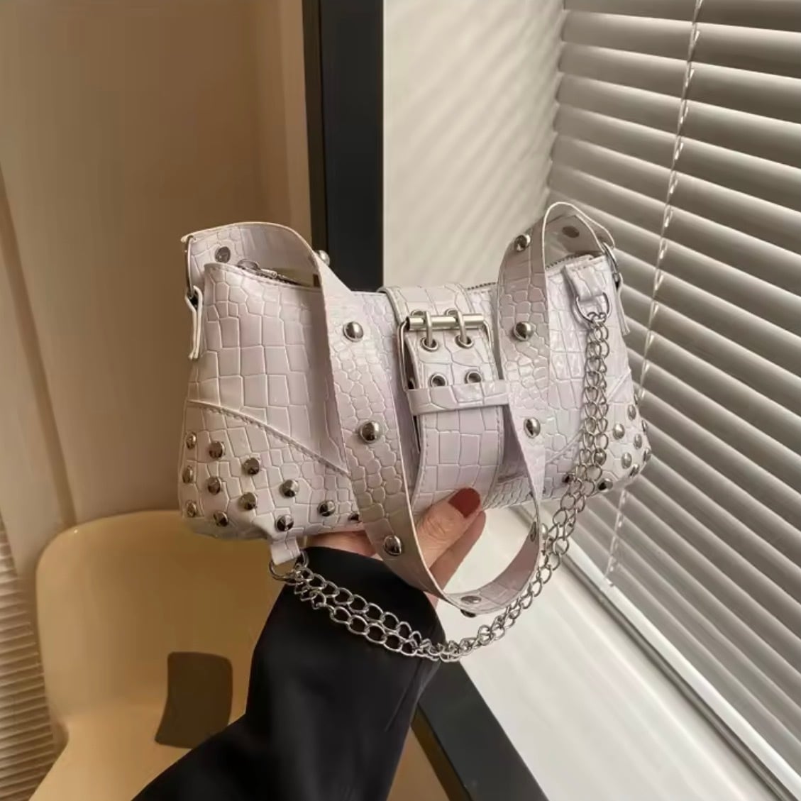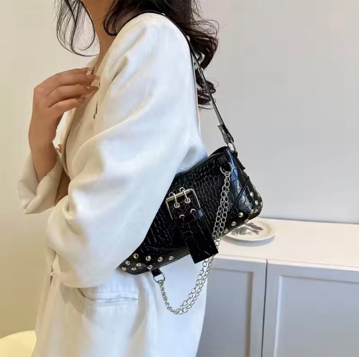 洗練されたロックテイストが魅力のチェーンハンドバッグ。