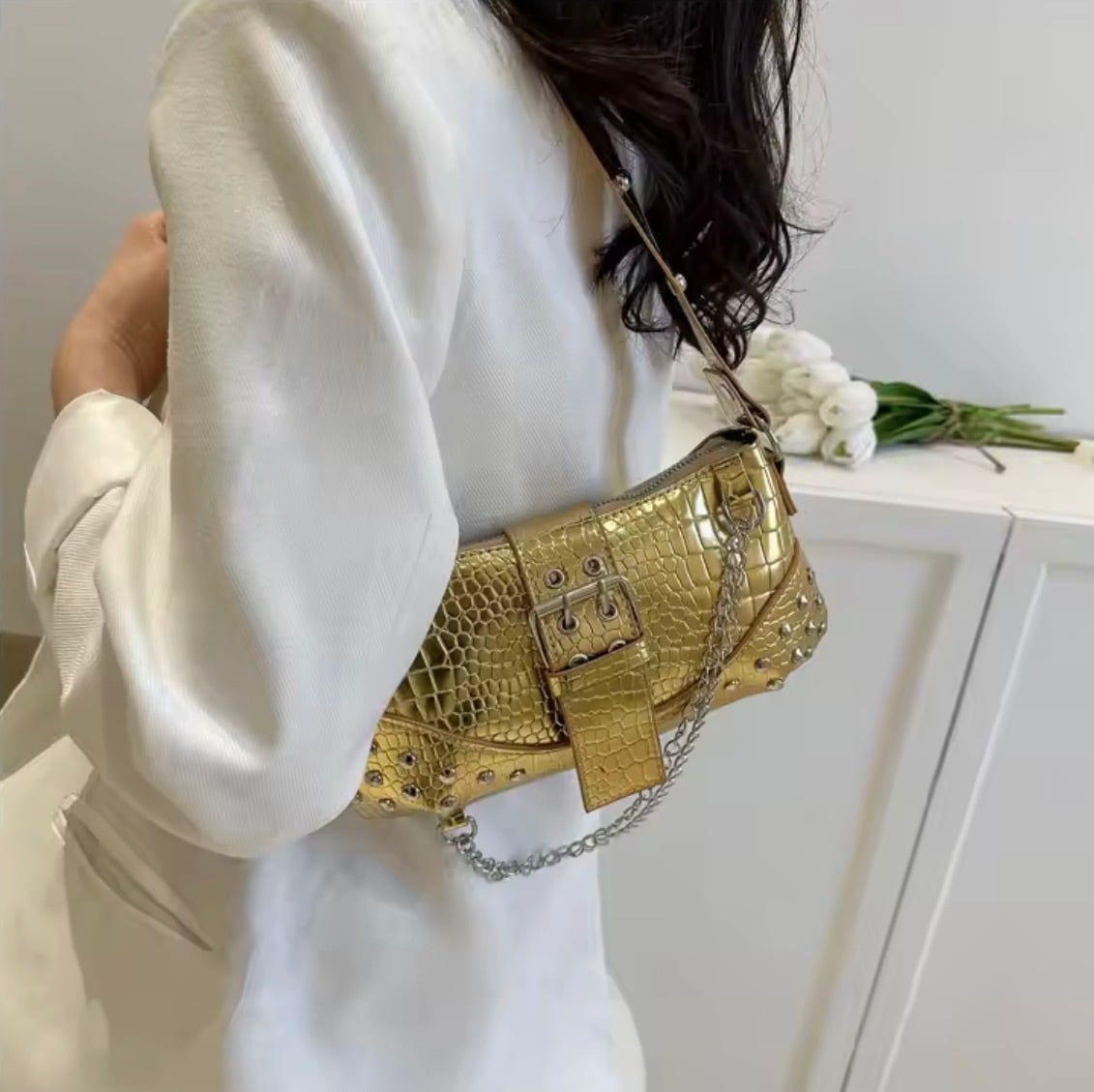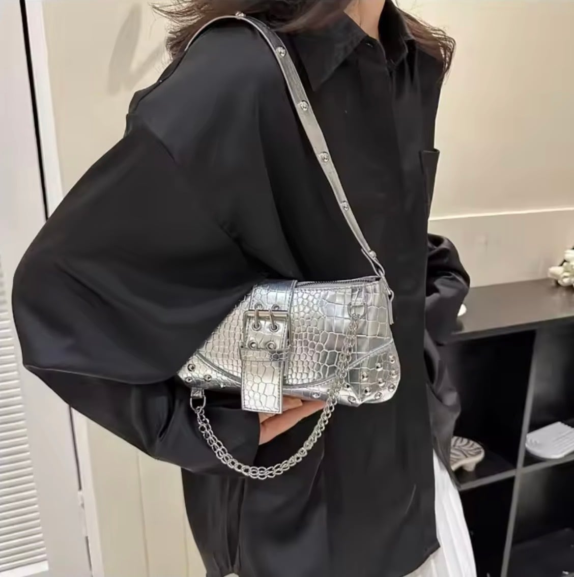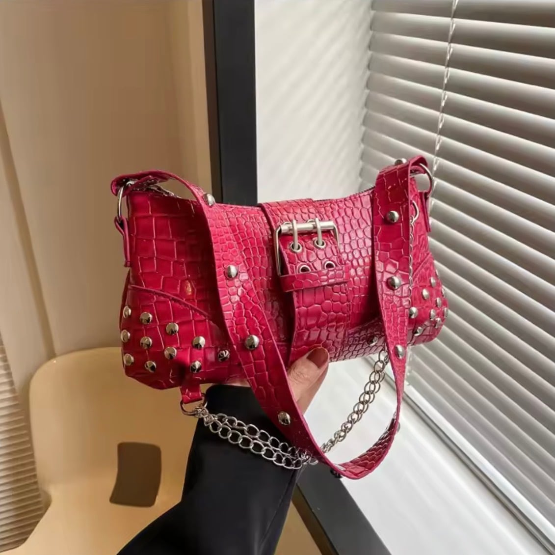 洗練されたロックテイストが魅力のチェーンハンドバッグ。