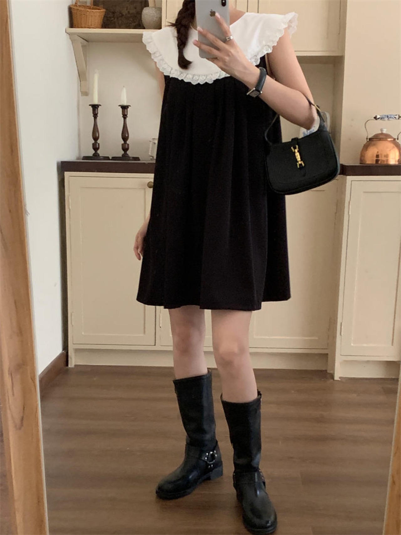大きめのレース襟が顔周りを華やかに演出し、ブラックのワンピースがコーデ全体の印象を引き締めてくれます。